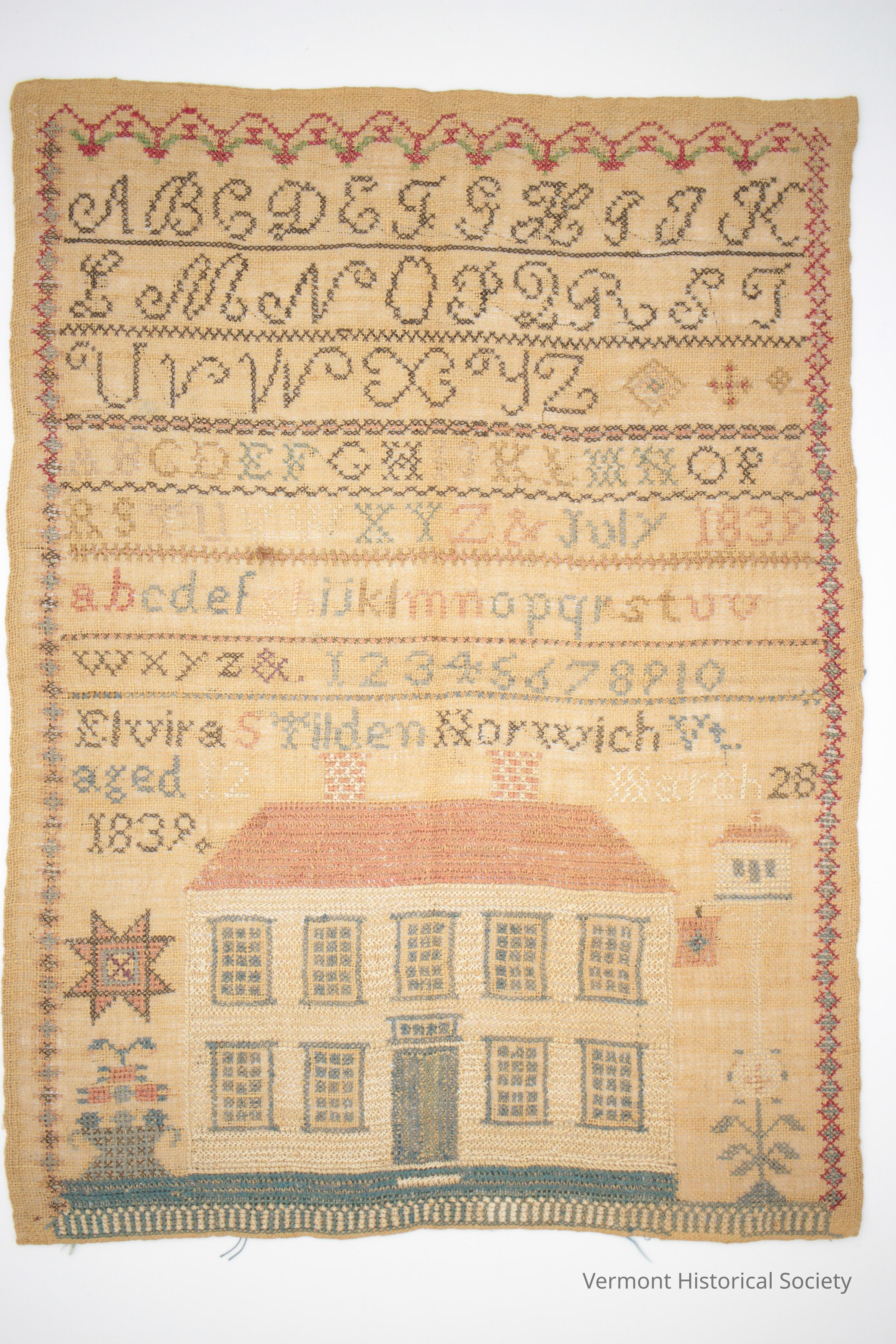 Linen sampler made by Elvira S. Tilden of Norwich, Vt., dated March 28, 1839. She was 12. Sampler includes 1 script alphabet in capital letters and two block letter alphabets, one upper case and one lower case, numbers 1-10, name of artist, date, and age. Lower third of sampler is landscape with house, sun and plants, surrounded by cross-stitched border in green, tan, red, brown and pink. She died Oct. 2, 1845. Quite coarse so likely home spun and woven. House stitches include: long arm cross and herringbone and regular cross. Colors are black, light rust, red, white, green, gold and blue.Acquisition
