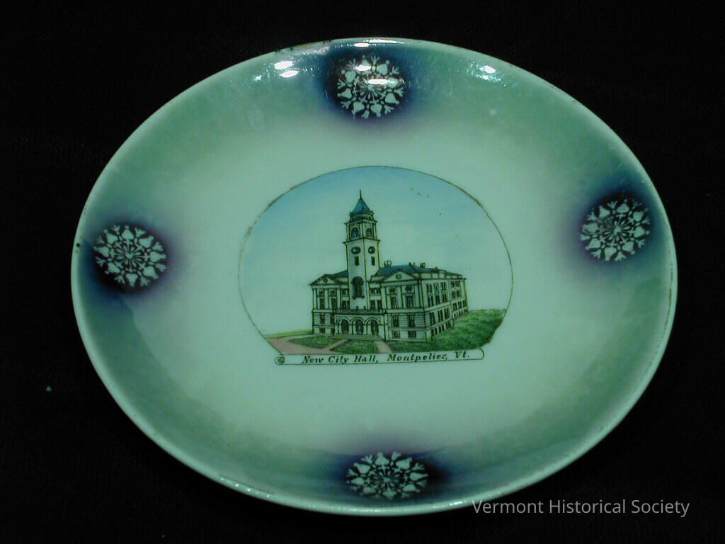 Grey lustered souvenir saucer printed with the image of a building with a tall, central tower. The image is labeled, "New City Hall, Montpelier, Vt." The border of the saucer is printed with snowflakes surrounded in purple.