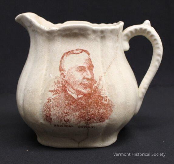 White ceramic pitcher. The pitcher is printed on one side with an engraved illustration of a man, shown from the bust up in red. The man has short hair and a large mustache. He is dressed in a double-breasted military jacket with shoulder insignia. The image is labeled, "ADMIRAL DEWEY." The other side is printed with an illustration of a ship with two masts for sails and two chimneys. The image is labeled, "U.S.S. MAINE".