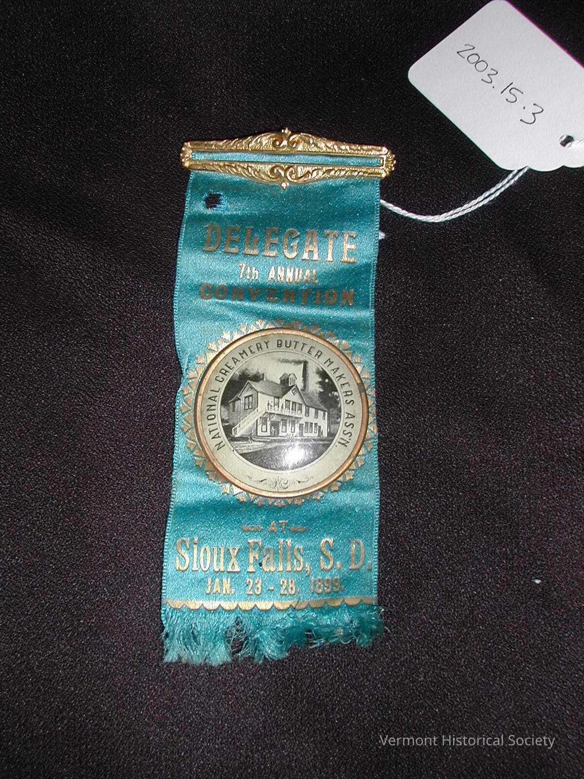 Blue silk ribbon with a molded metal bar across the top and a metal medallion in the center. The ribbon is printed in gold with the inscription, "DELEGATE 7TH ANNUAL CONVENTION AT Sioux falls, S. D. JAN. 23 - 28, 1899". The central medallion is printed with an image of a building and the inscription, "NATIONAL CREAMERY BUTTER MAKERS ASS'N." There is a blue, shield-shaped sticker on the back that reads, "FRANK TUTTLE MANF'G OF SOCIETY GOODS BNNER FLAGS AND BADGES ELGIN. ILL."Context