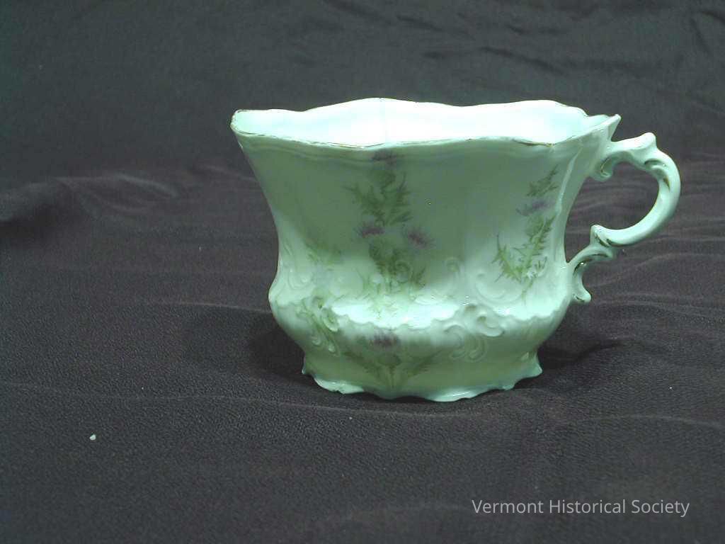 Ornate white teacup with purple and green thistles printed on the exterior. The cup is lobed with molded scrollwork between each section. The bottom is marked, "Weimar / Germany".
