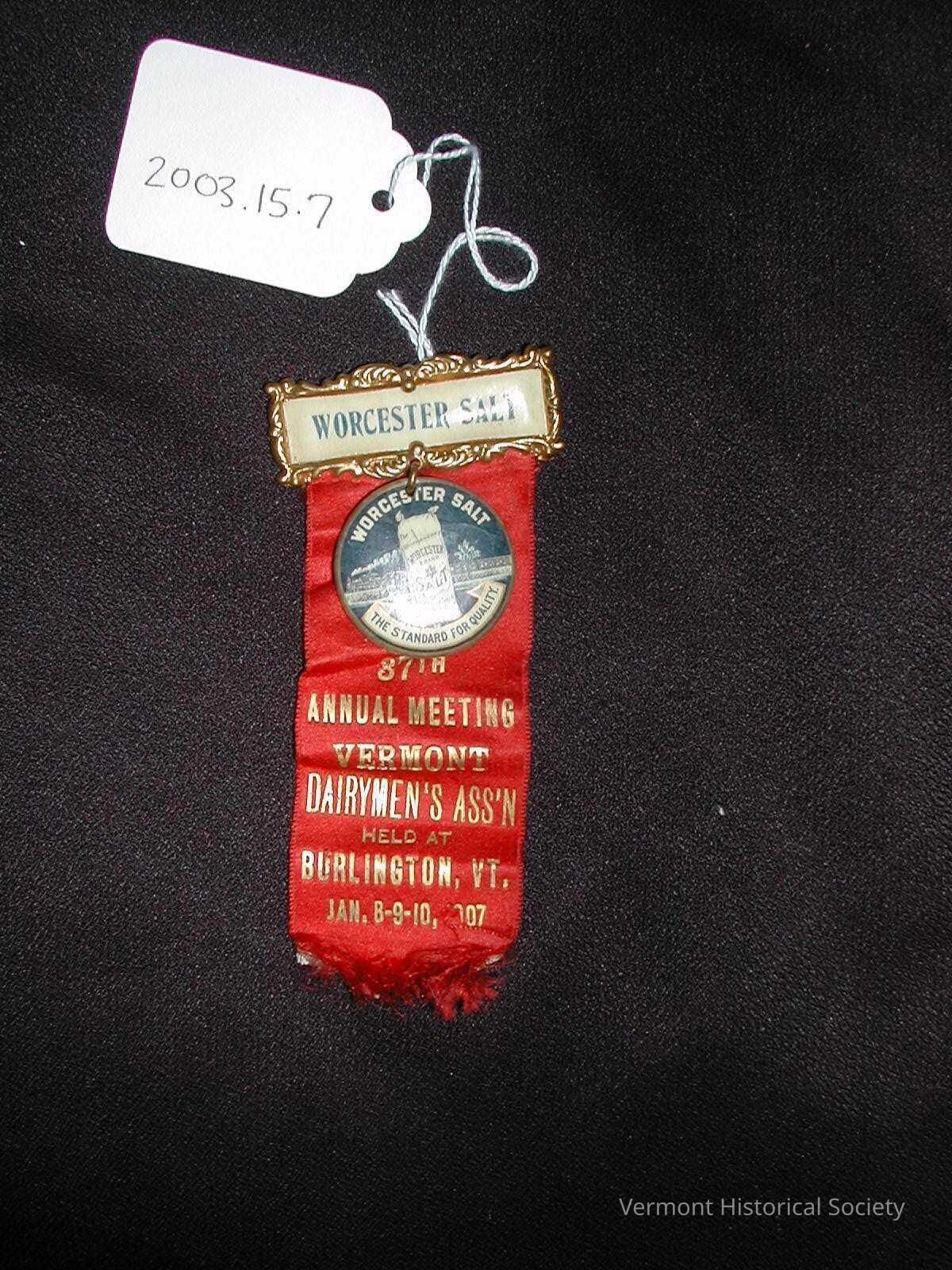 Red silk ribbon with metal bar at the top. The bar is printed with the inscription, "WORCESTER SALT" and has a round, metal medallion hanging from the center with an image of a large back of salt and the inscription, "WORCESTER SALT THE STANDARD FOR QUALITY." The ribbon is printed in gold with the inscription, "ANNUAL MEETING VERMONT DAIRYMEN'S ASS'N HELD AT BURLINGTON, VT. JAN, 8-9-10, 1907". The back of the ribbon has an attached paper label with the manufacturer's details and a long advertisement of their wares.Context