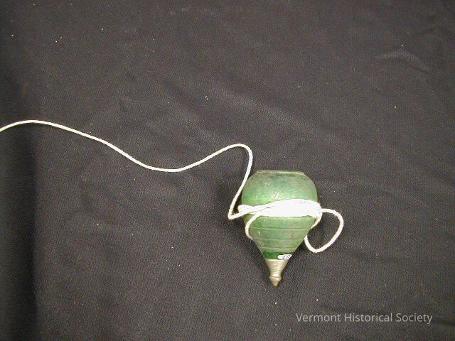 Green-painted wooden top. The top is tear-drop shaped and has a metal point. It is wrapped with a white cotton cord that has an unpainted wooden bead strung onto the end.Context