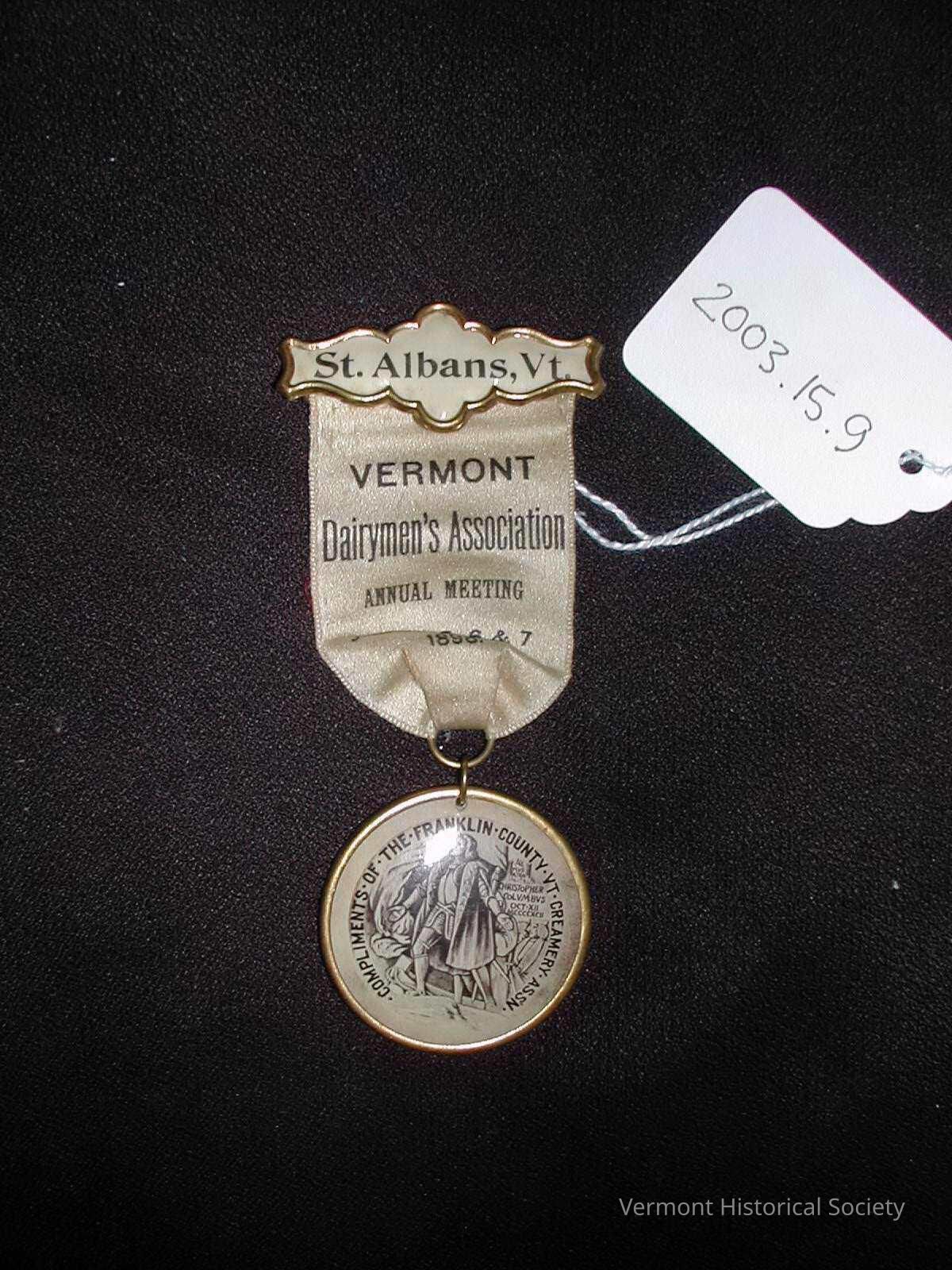 Cream-colored silk ribbon with a metal bar across the top and a round metal medallion hanging from the bottom. The top bar is printed with the inscription, "St. Albans, Vt." The ribbon is printed in black with the inscription, "VERMONT Dairymen's Association ANNUAL MEETING JAN. 4, 5, 6 & 7 1898". The bottom edge of the ribbon is gathered to the center and secured around a metal ring. From the ring hangs a round metal button printed with an image of a man in 16th-century dress and the inscription, "COMPLIMENTS OF THE FRANKLIN COUNTY VT CREAMERY". The reverse of the medallion is printed with the inscription, "WORLD'S COLUMBIAN EXPOSITION IN COMMEMORATION OF THE FOUR HUNDREDTH ANNIVERSARY OF THE LANDING OF COLUMBUS MDCCCXCII - MDCCCXCIII TO FRANKLIN COLK VERMONT CREAMERY ASSN."Context