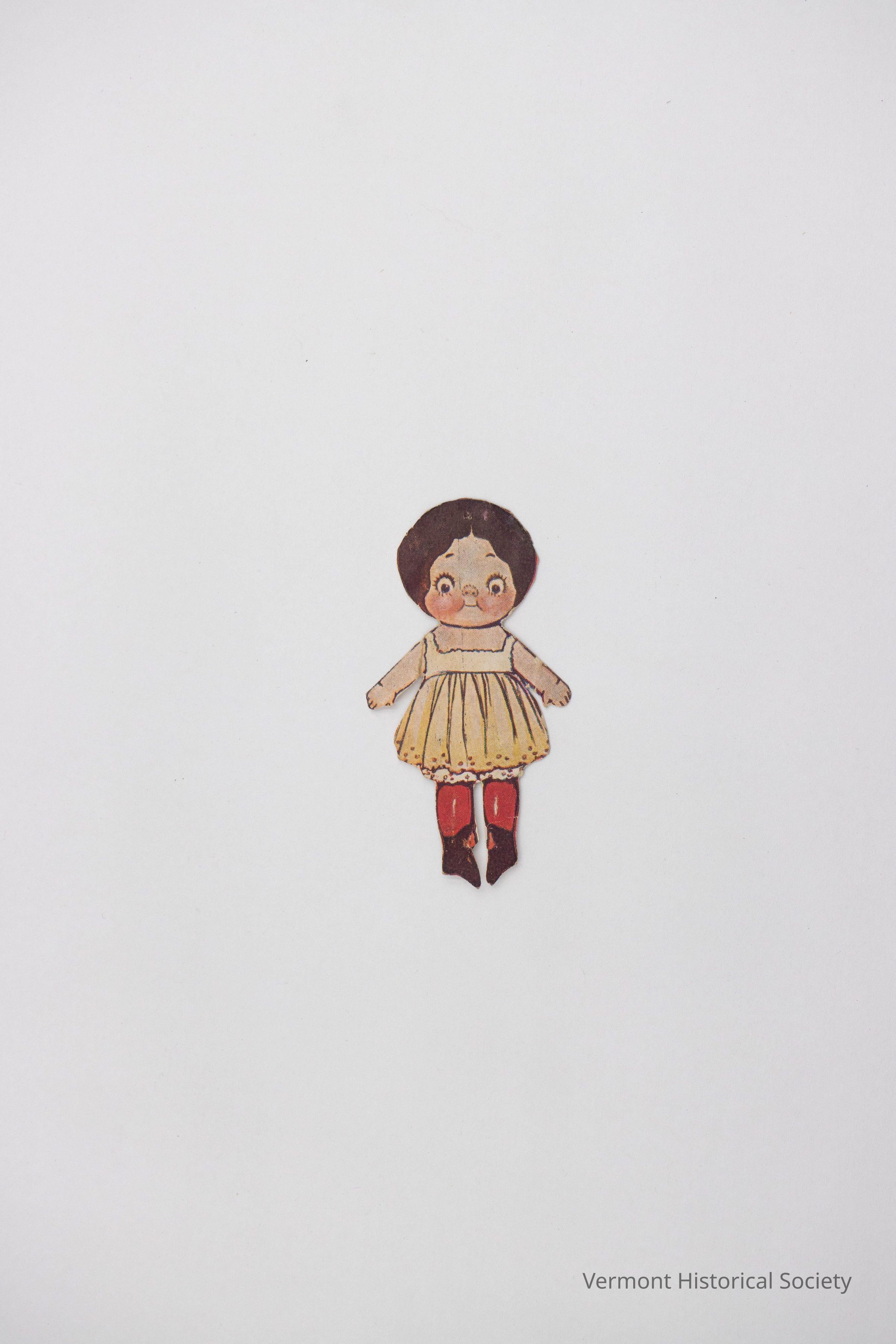Paper doll accessory showing a toy doll wearing a white dress with red stockings. The back shows a portion of a page of a magazine.Context