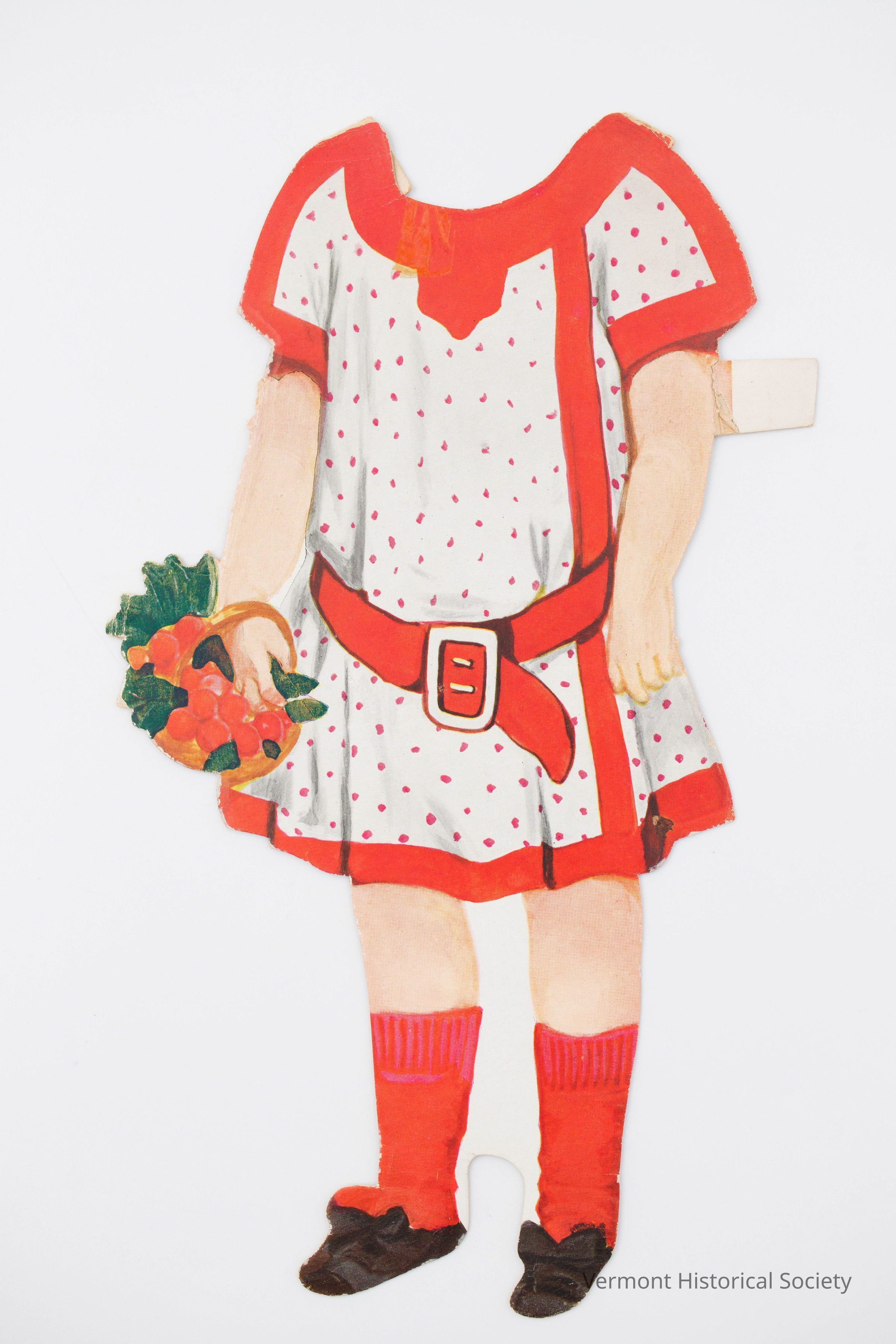 Large, paperboard doll dress. The dress is white with red dots and borders, and a red belt around the dropped waist. The skirt is short, and the legs are included, showing mid-shin red socks and black shoes.Context
