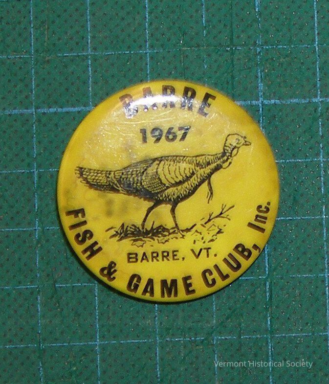 Round yellow button printed in black with an image of a turkey and the inscription, "BARRE FISH & GAME CLUB, Inc." around the edge. The date 1967 is above the turkey, and the words, "BARRE, VT." are below the turkey. There is a pin on the reverse.Context