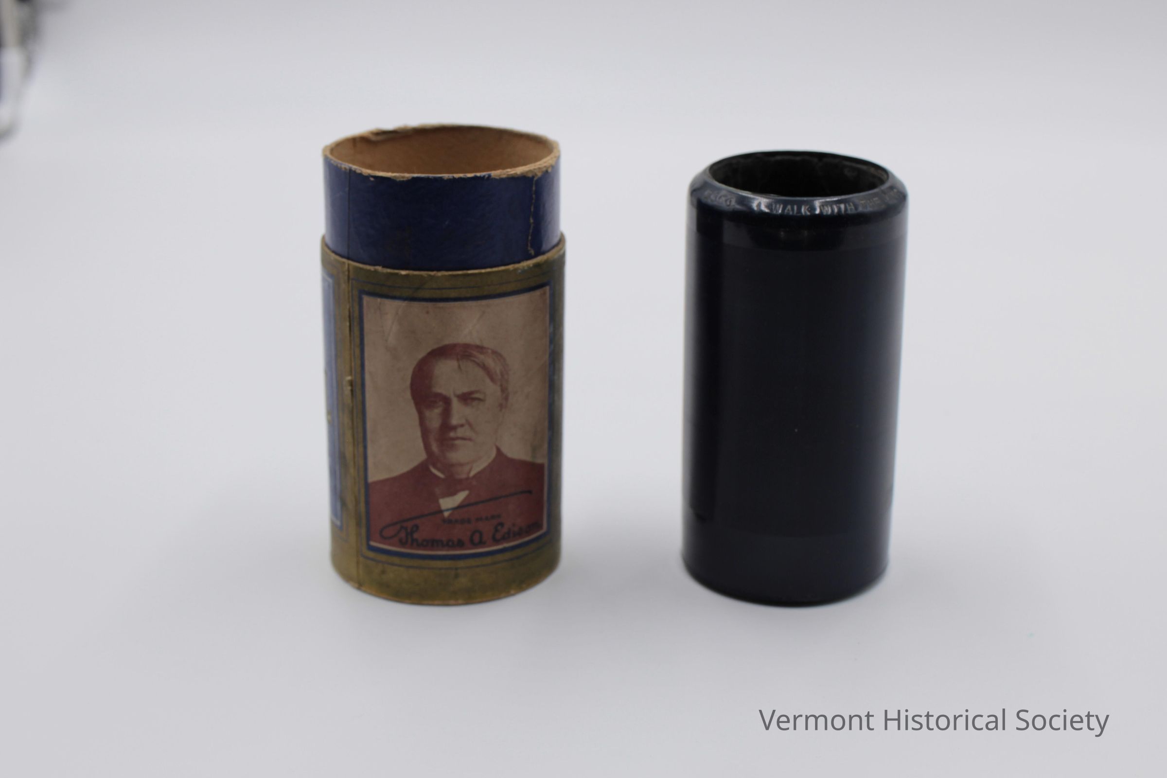 Black phonograph cylinder with a cardboard case. The cylinder, or "record", is a hollow cylinder consisting of hard, blue, ridged celluloid around a concrete core. One edge of the cylinder is labeled in white with the words, "2350 I WALK WITH THE KING. RODEHEAVER / Thomas A Edison PAT'D. 24."Use