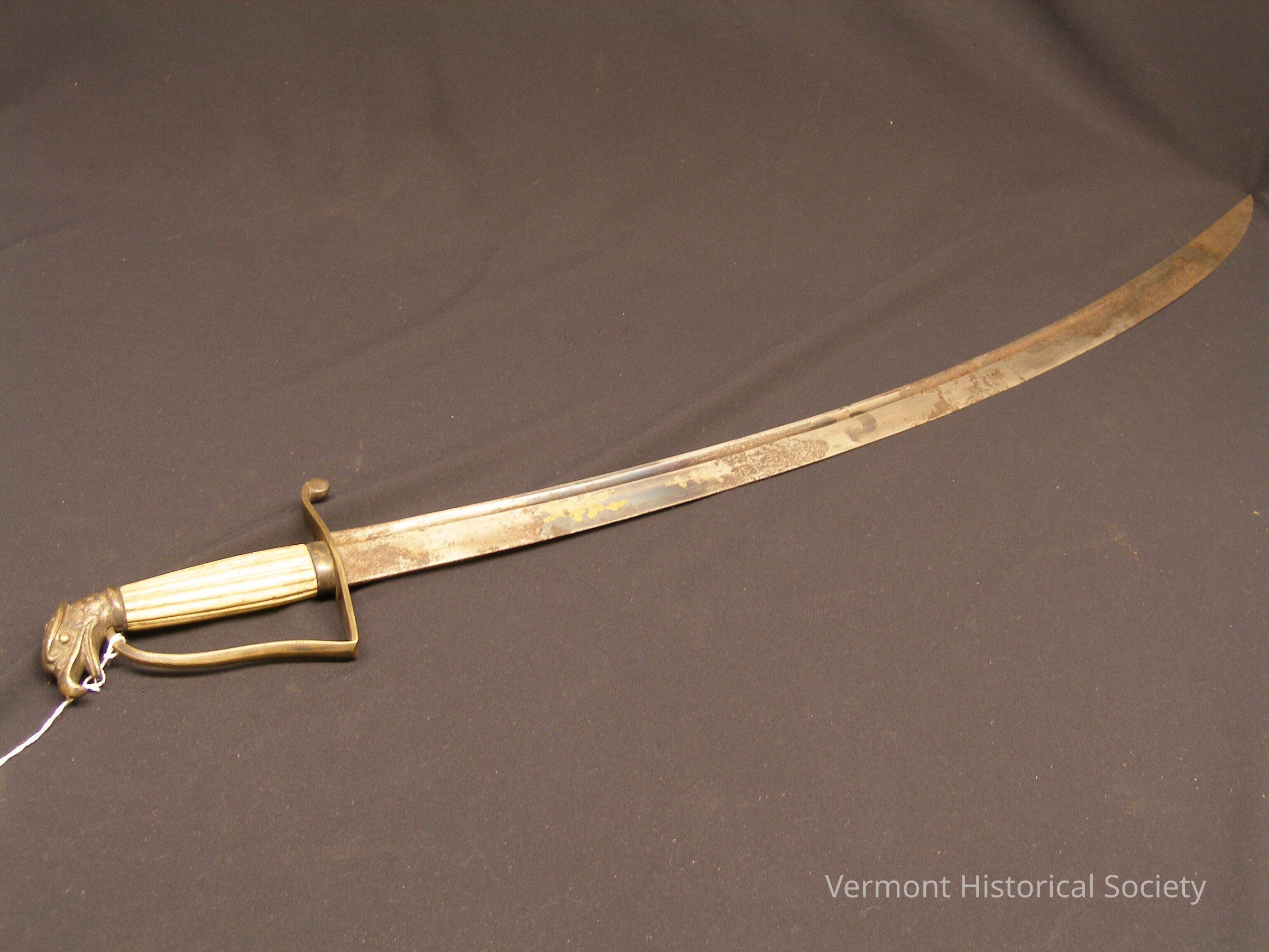 Curved sword with leather scabbard. The handle of the sword is ivory, and the pommel is in the shape of an eagle's head. The blade is lightly engraved with an all-over floral design.