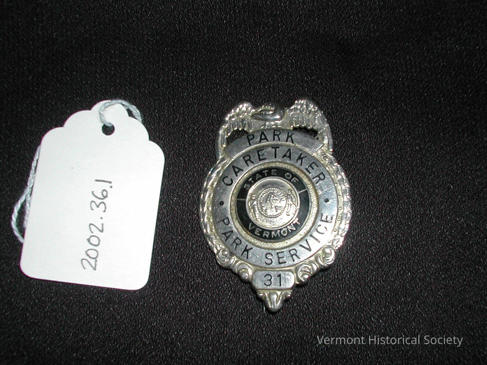 Metal park caretaker badge. The metal badge is a rampant eagle crowning the top of a circular shield with a decorated border. Two men are on either side of the Vermont state coat of arms in the center of the shield. The words “PARK / CARETAKER / PARK SERVICE / 31” are in a solid band surrounding a smaller black band with the words “STATE OF / VERMONT” around the coat of arms.Context