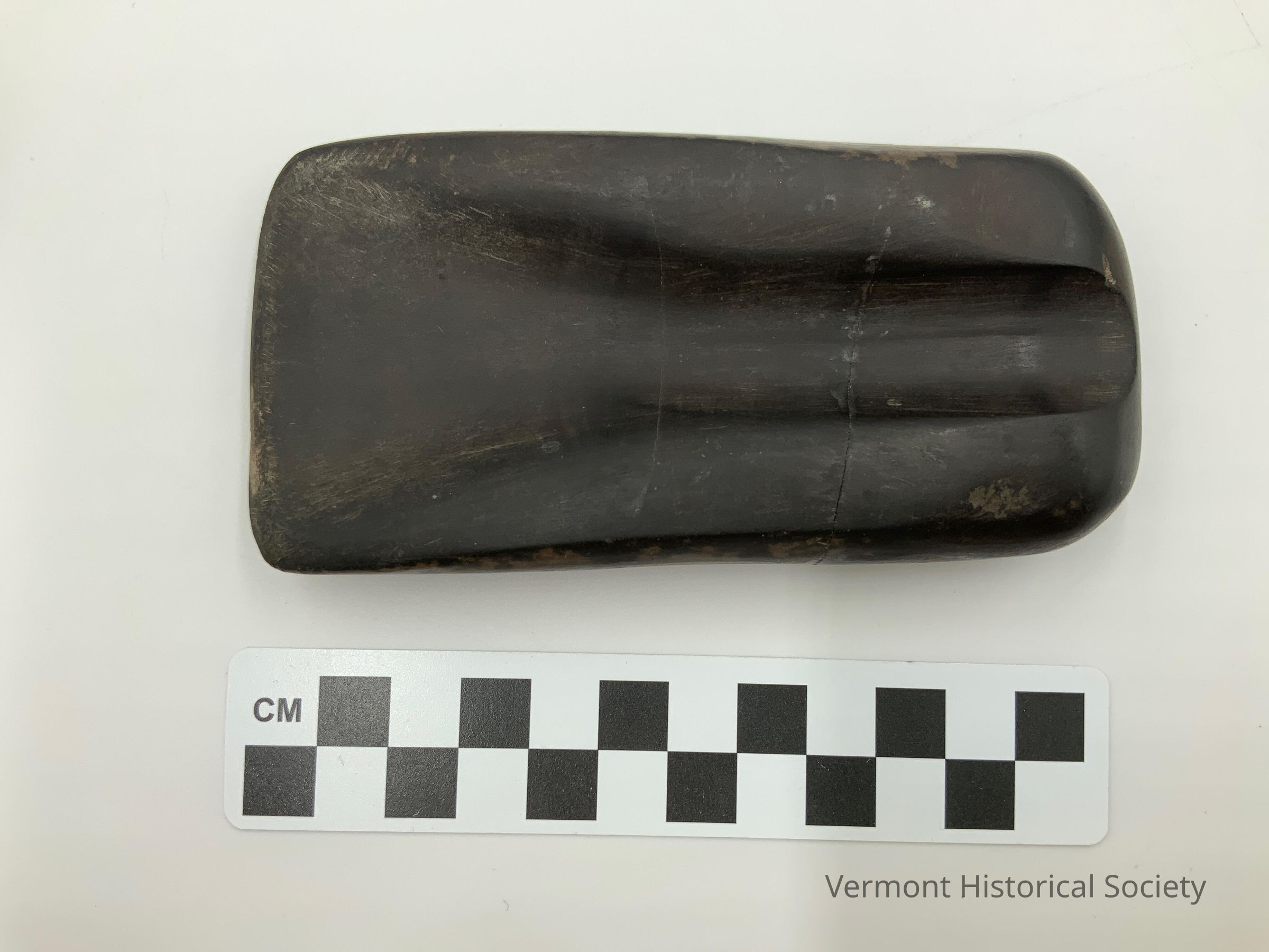 Ground stone gouge made of black chert. The surface is completely ground and polished, and there are grinding marks still visible. The distal end is ground to a sharp blade edge. There is a groove that runs the full length of the body, becoming more constricted and rounded at the proximal end and flaring outward at the distal end.Context