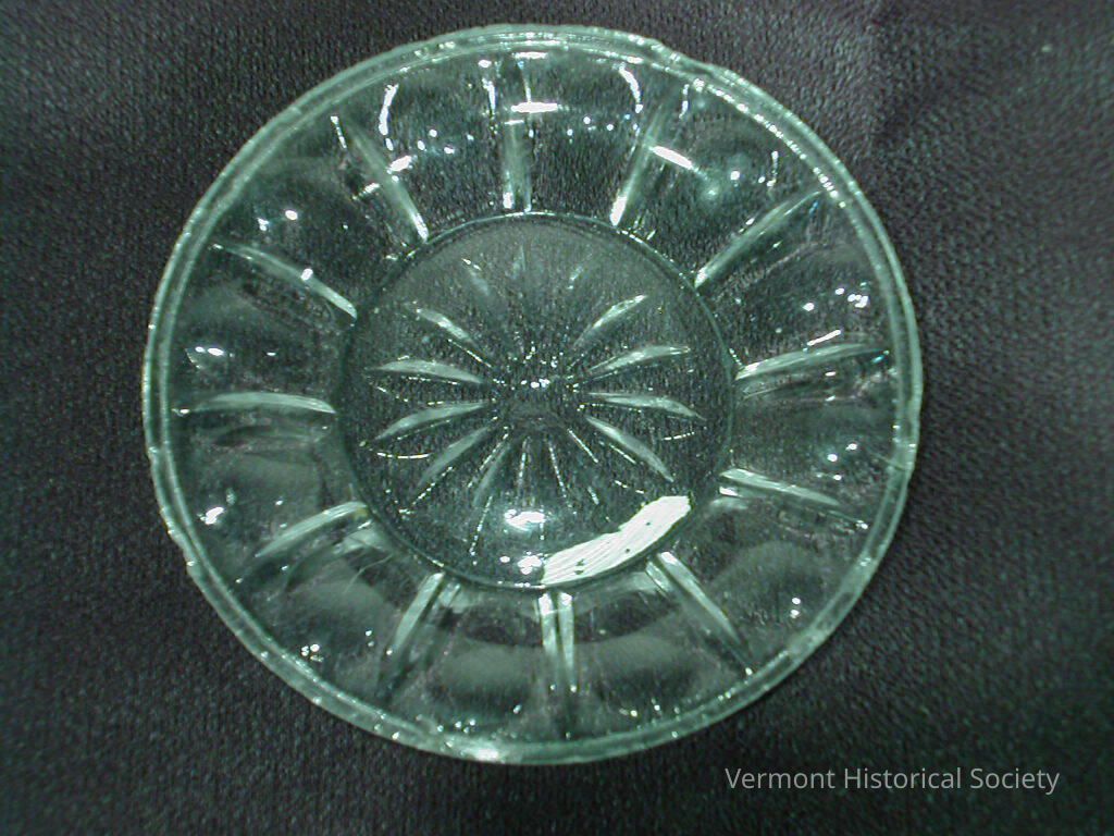 Pressed glass cup plate. Sunburst design on bottom & alternating thumbpint pattern along edge.