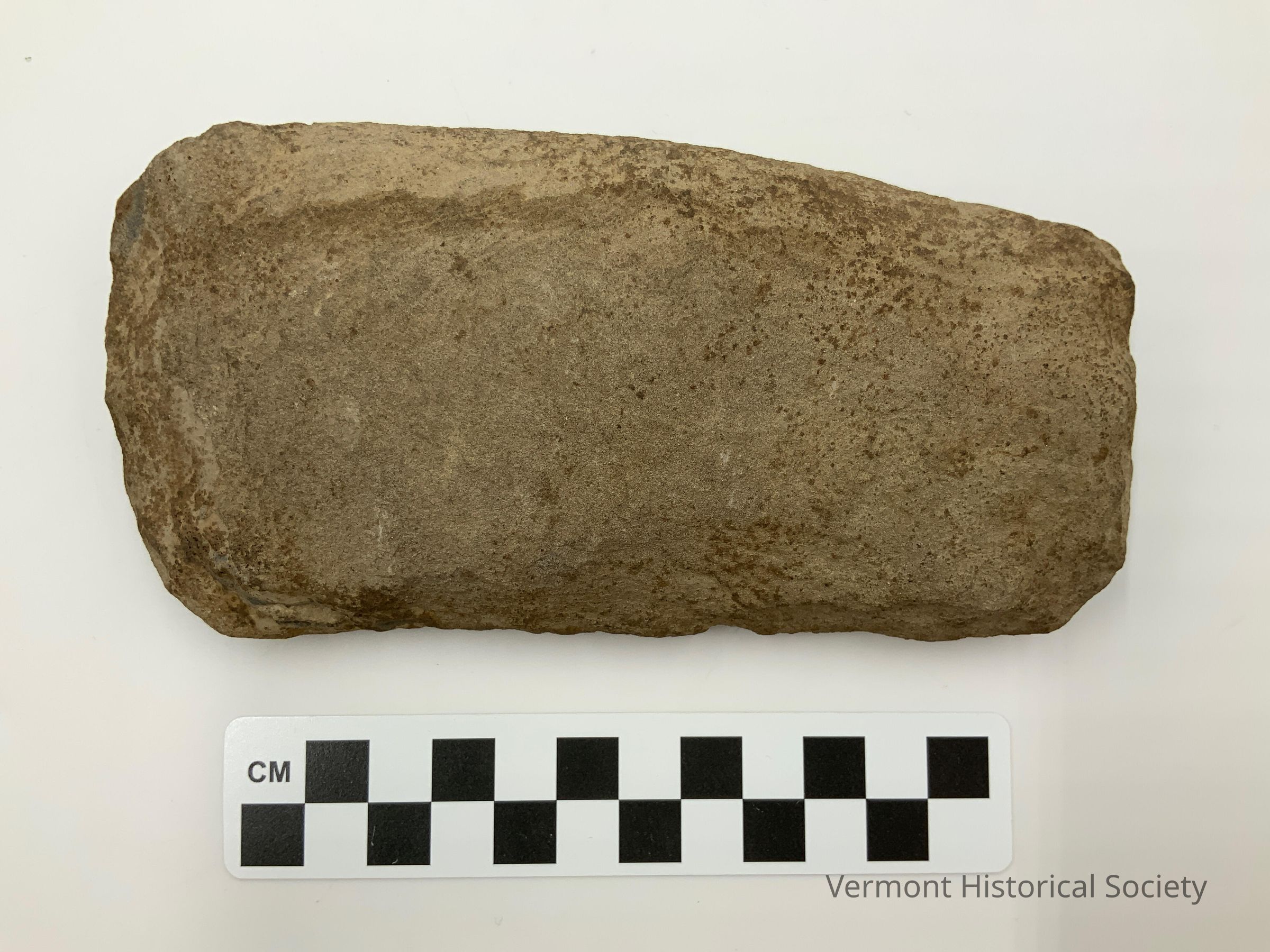 Chipped stone tool made from a naturally rectangular stone. Three edges are chipped to thin them.Context