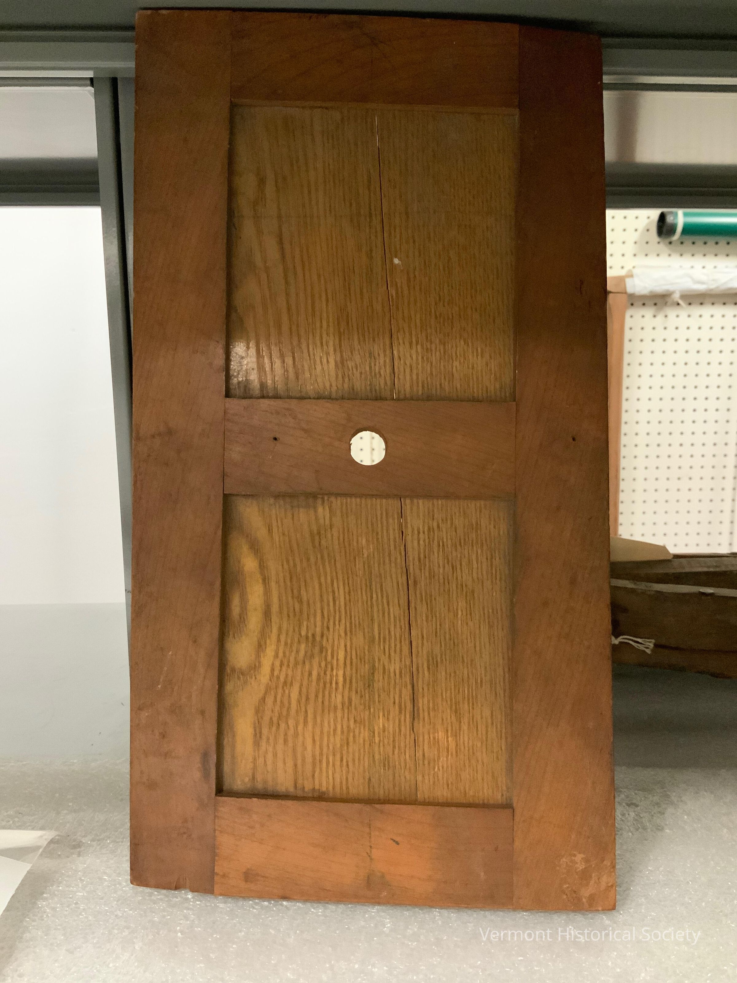 Lid for a patent model of a milk cooler. The rectangular lid is made from paneled wood and has a circular hole in the center.Context