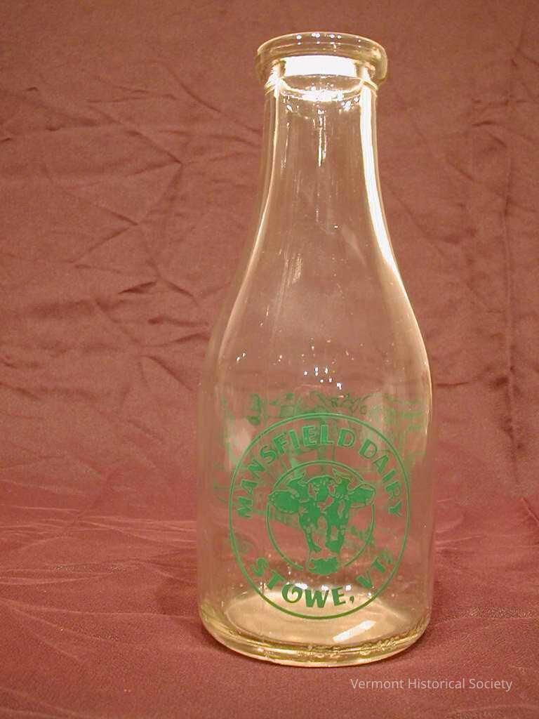 Milk bottle printed in green with a skiing cow on one side and the circular logo for Mansfield Dairy on the other.