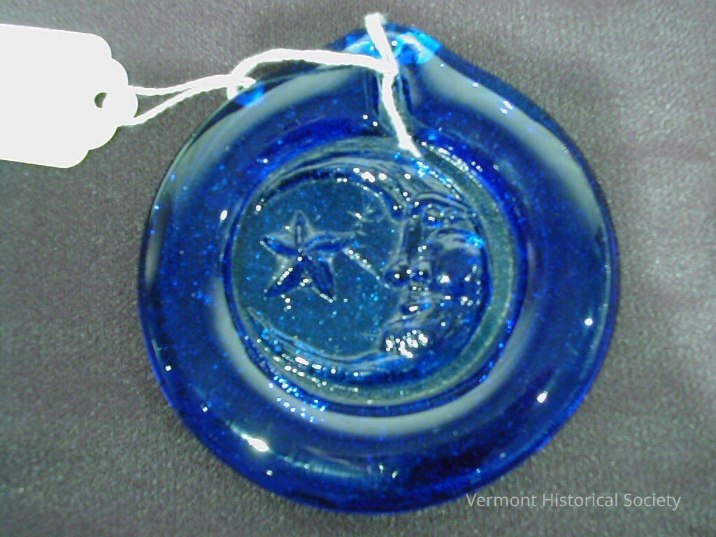 Seal style pressed glass "suncatcher" window ornament. The ornament consists of a blown or free-formed mass of glass pressed down in the center with a stamp or press in the form of a crescent moon and star. The mass is drawn upward and pinched at the top to form a hole for hanging.Context