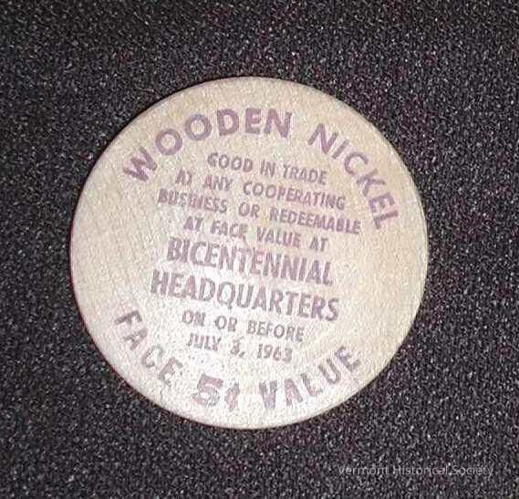 Wooden token printed with purple ink. One side is printed with the the inscription, "WATERBURY, VT. June 30th thru July 6th" around the edge, and images of four buildings above a central banner and flooded building in water below the banner. The banner reads, "WATERBURY, VERMONT BICENTENNIAL". The other side of the token is printed with the inscription, "WOODEN NICKEL GOOD IN TRADE AT ANY COOPERATING BUSINESS OR REDEEMABLE AT FACE VALUE AT BICENTENNIAL HEADQUARTERS ON OR BEFORE JULY 3, 1963 FACE 5c VALUE".Context