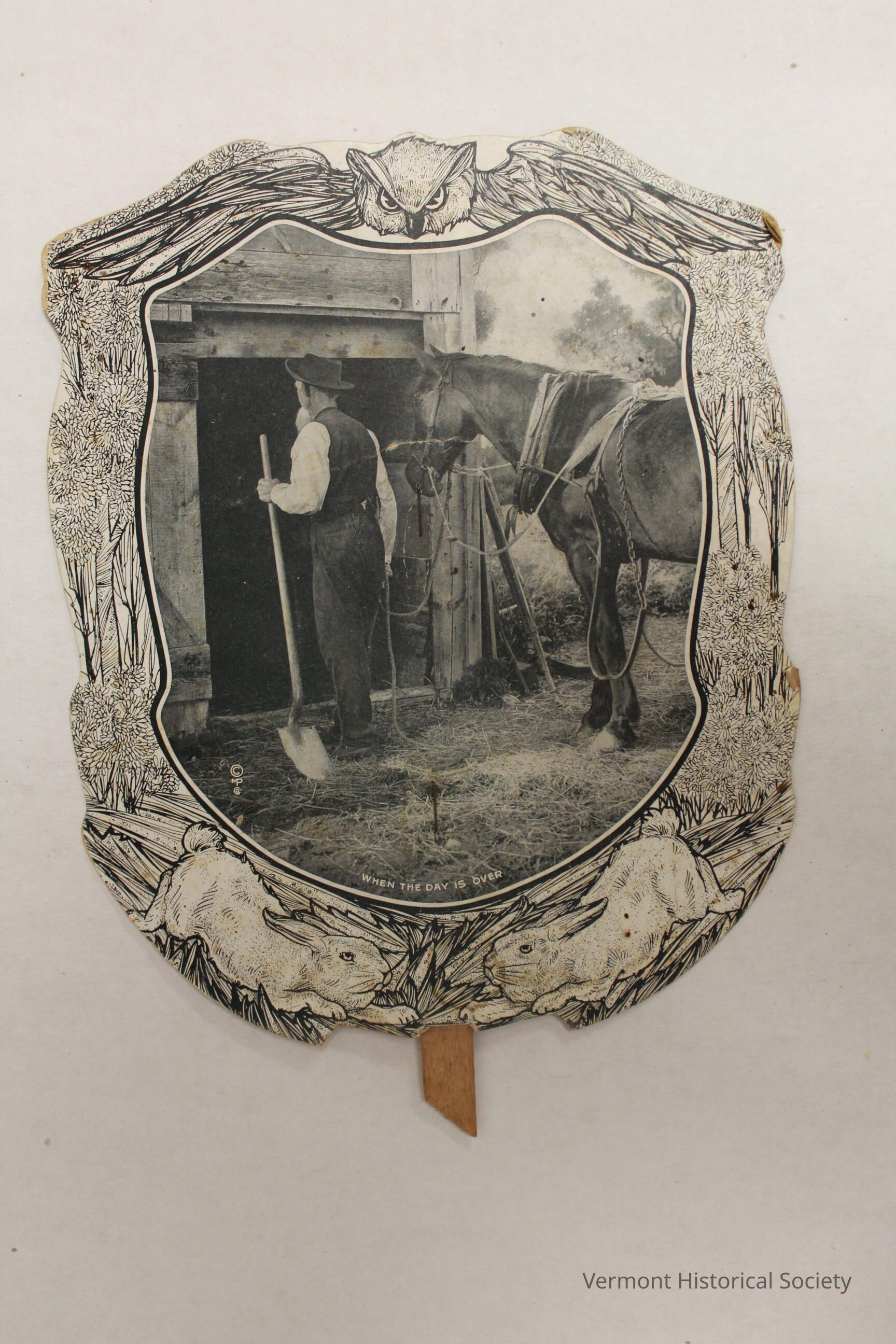 Hand fan made of a paperboard stapled to a wooden shim. The fan board is in the shape of a shield and is printed with a border that shows an owl at the top, flowers at the sides, and rabbits at the bottom. In the center is a black-and-white photograph of a man leading a horse into a building. The man is wearing a hat, vest, shirt, and pants, and is carrying a shovel. He has a long white beard. The horse is wearing blinders and a plow harness. The image is labeled at the center bottom, "WHEN THE DAY IS OVER".