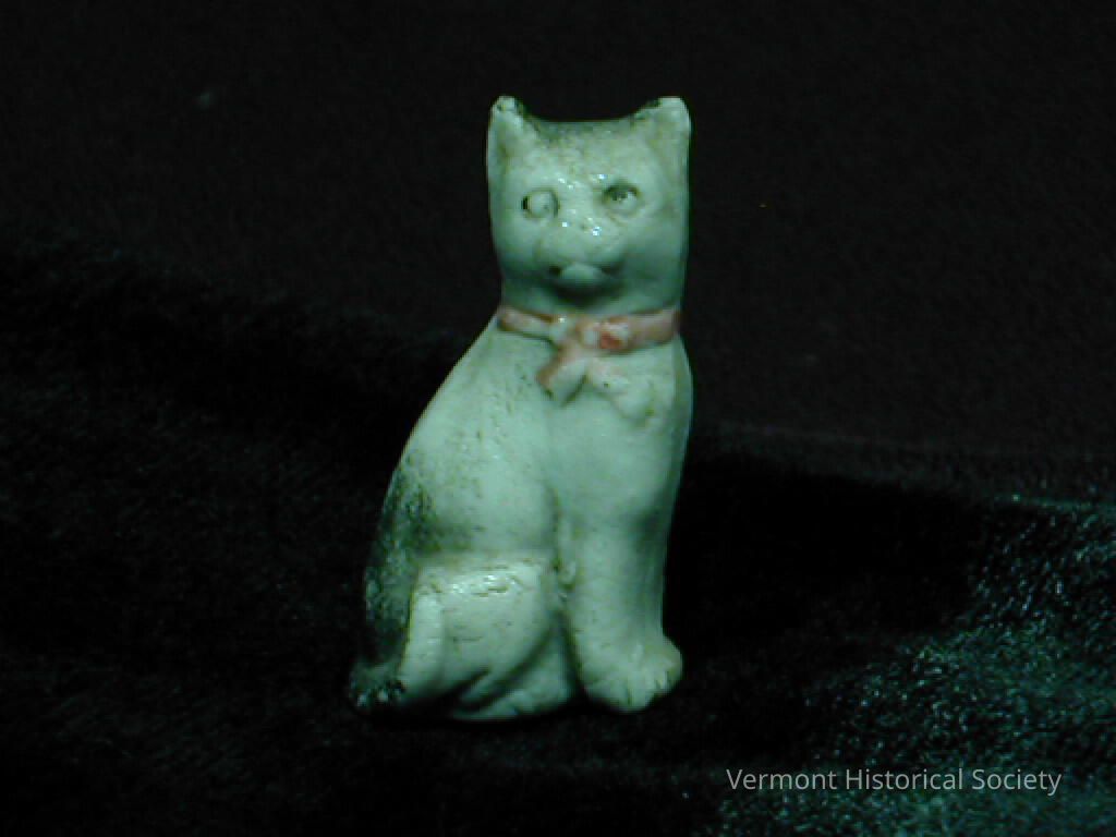 Miniature bisque ceramic figurine of a sitting cat. The cat is painted in shades of black and grey near the tail and on the head. A red-painted ribbon is molded around its neck.