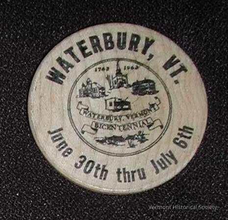 Wooden token printed with black ink. One side is printed with the the inscription, "WATERBURY, VT. June 30th thru July 6th" around the edge, and images of four buildings above a central banner and flooded building in water below the banner. The banner reads, "WATERBURY, VERMONT BICENTENNIAL". The other side of the token is printed with the inscription, "WOODEN NICKEL GOOD IN TRADE AT ANY COOPERATING BUSINESS OR REDEEMABLE AT FACE VALUE AT BICENTENNIAL HEADQUARTERS ON OR BEFORE JULY 3, 1963 FACE 5c VALUE".Context
