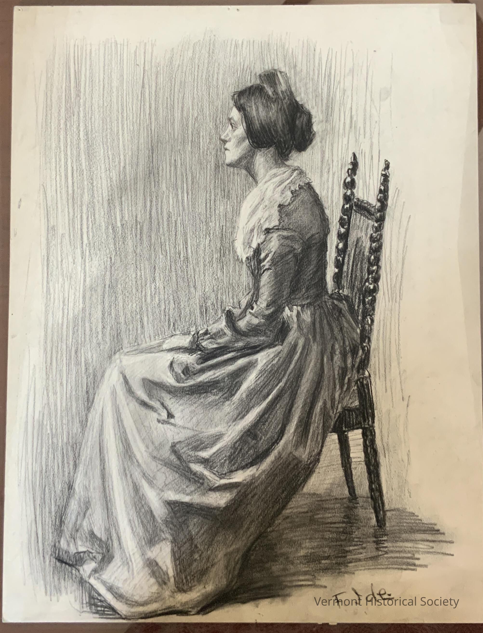 A full length portrait of a woman in profile sitting in a chair. The chair is carved and ornate. She wears a dark dress with a kerchief around her neck and her hair is up. There are shadows around her. Signed in the bottom right corner and undated.Type of Drawing