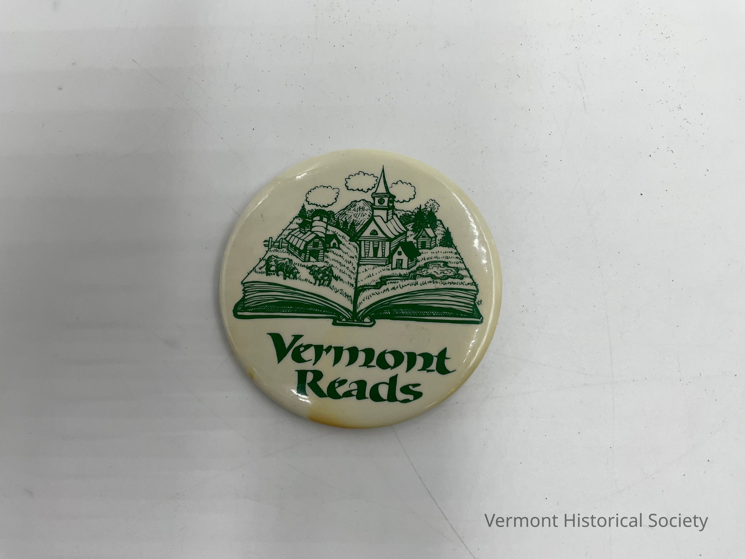 White button with a green image of an open book with stereotypical scene of Vermont and underneath the words, "Vermont Reads."Context