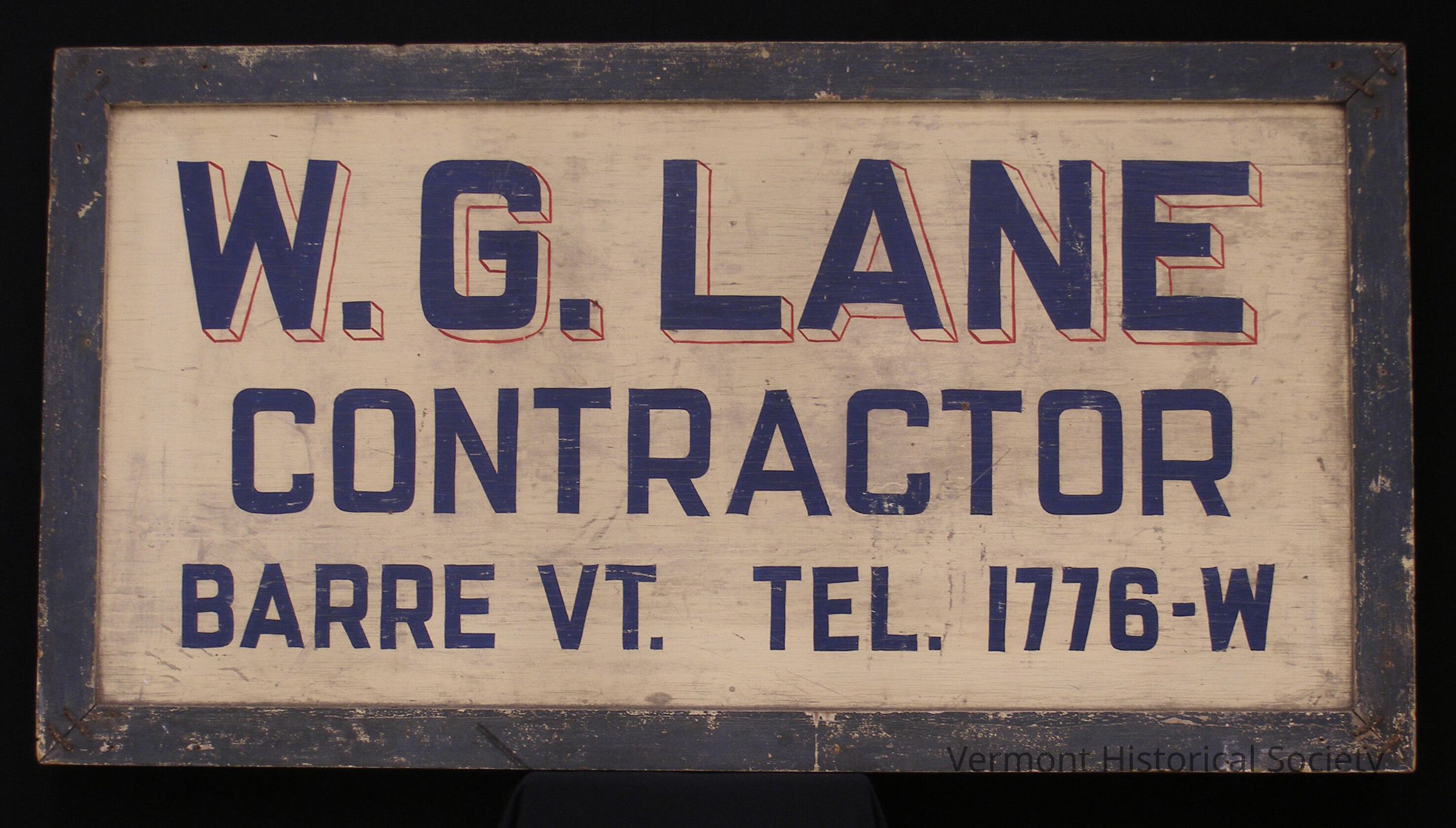 Rectangular wooden sign painted with the inscription, "W. G. LANE CONTRACTOR BARRE VT. TEL. 1776-W". The words are painted blue on a white ground and there is a blue border on all four sides.