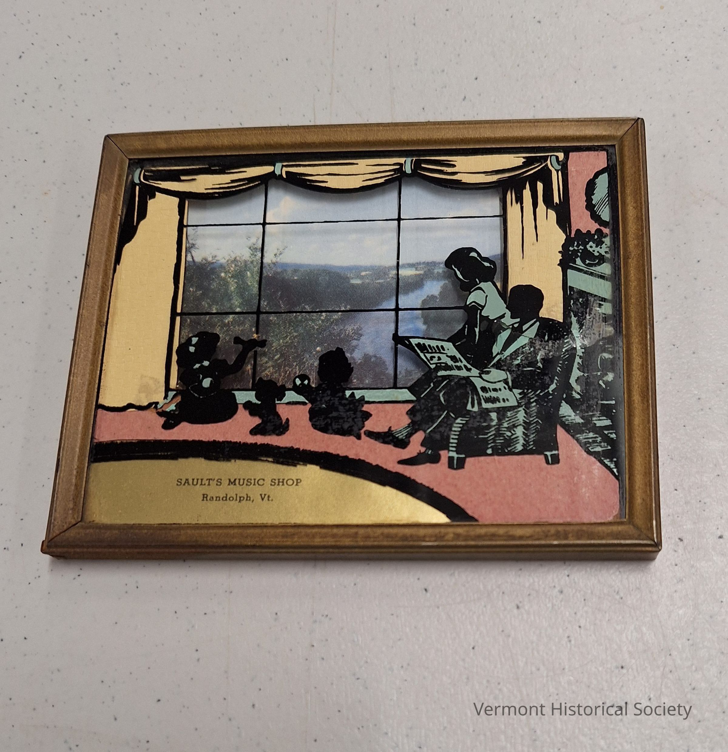 Reverse-painted glass miniature of a family playing in an interior setting with a printed photographic image of a river outside the window. The lower left corner reads, "SAULT'S MUSIC SHOP / Randolph, Vt."Context