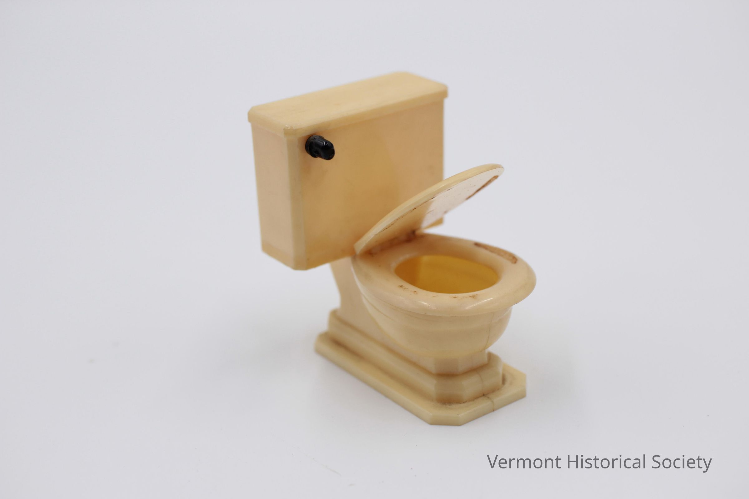 Miniature plastic toilet. The toilet has a rectangular reservoir set immediately over the bowl. The bowl has a stationary seat and a hinged lid. The flush handle is black.Context