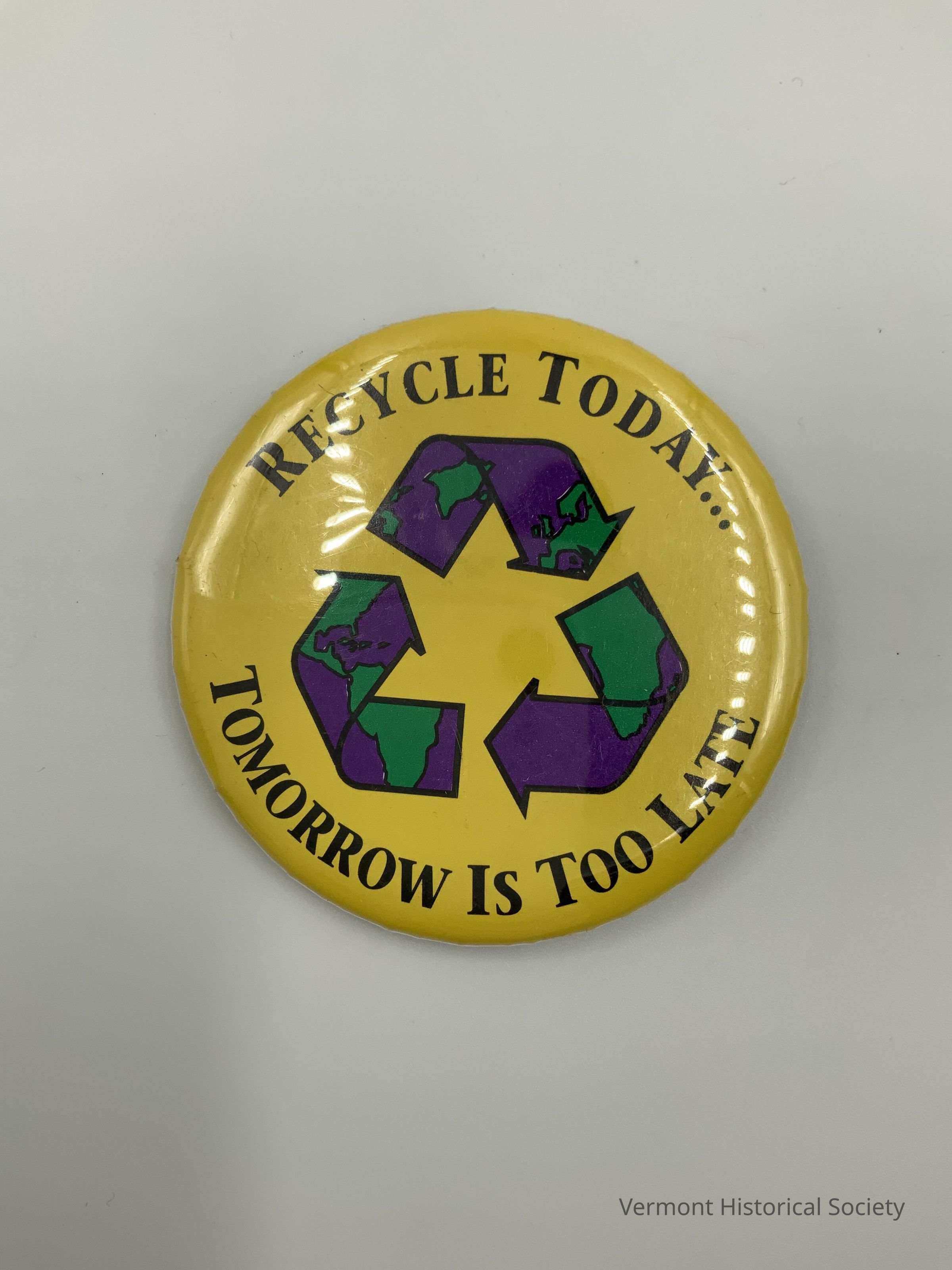 Round yellow button printed with the inscription, "RECYCLE TODAY... / TOMORROW IS TOO LATE" around the edge and the triangular recycling symbol in the center. The symbol, which consists of three arrows pointing around a triangle, is filled with a pattern of the earth's oceans and continents.