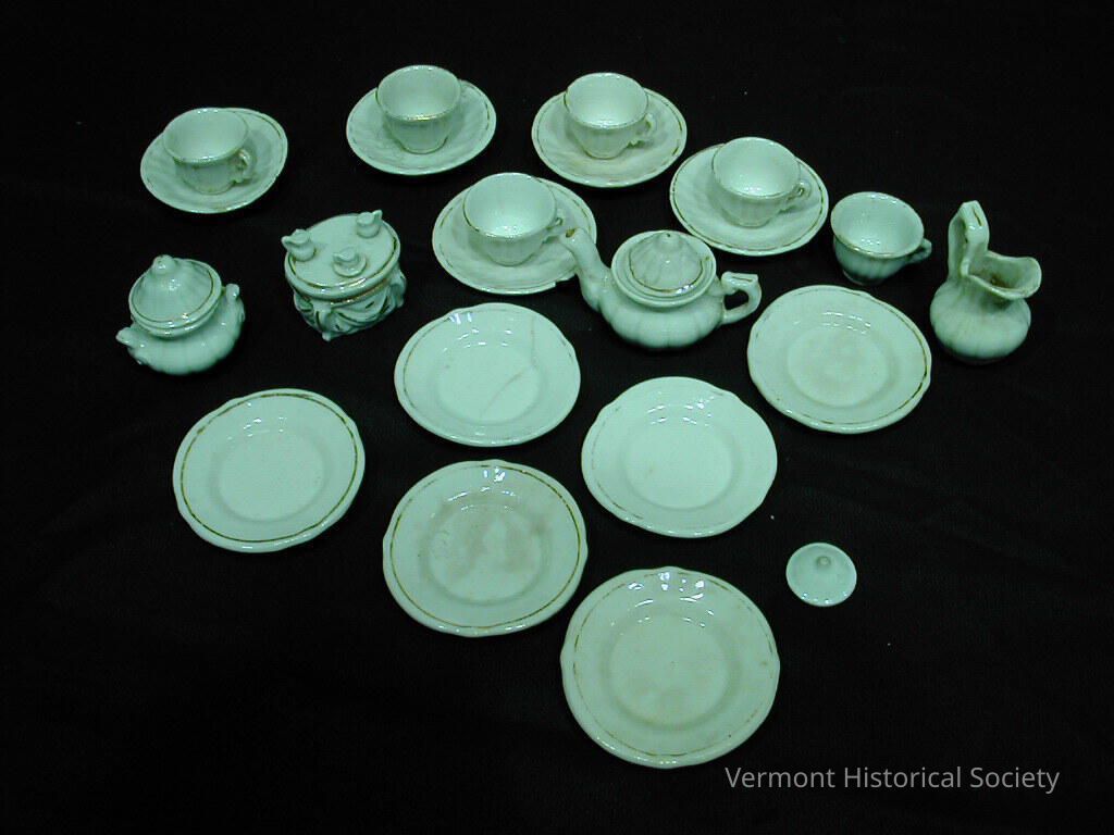 Child's toy tea set. The set includes a teapot, a cream pitcher, a lidded sugar bowl, 6 teacups, 5 saucers, 6 dessert plates, an unmatched lid, and another, more miniature tea set. The pieces are white bodied ceramics with thin lines of gilding around the edges.Context