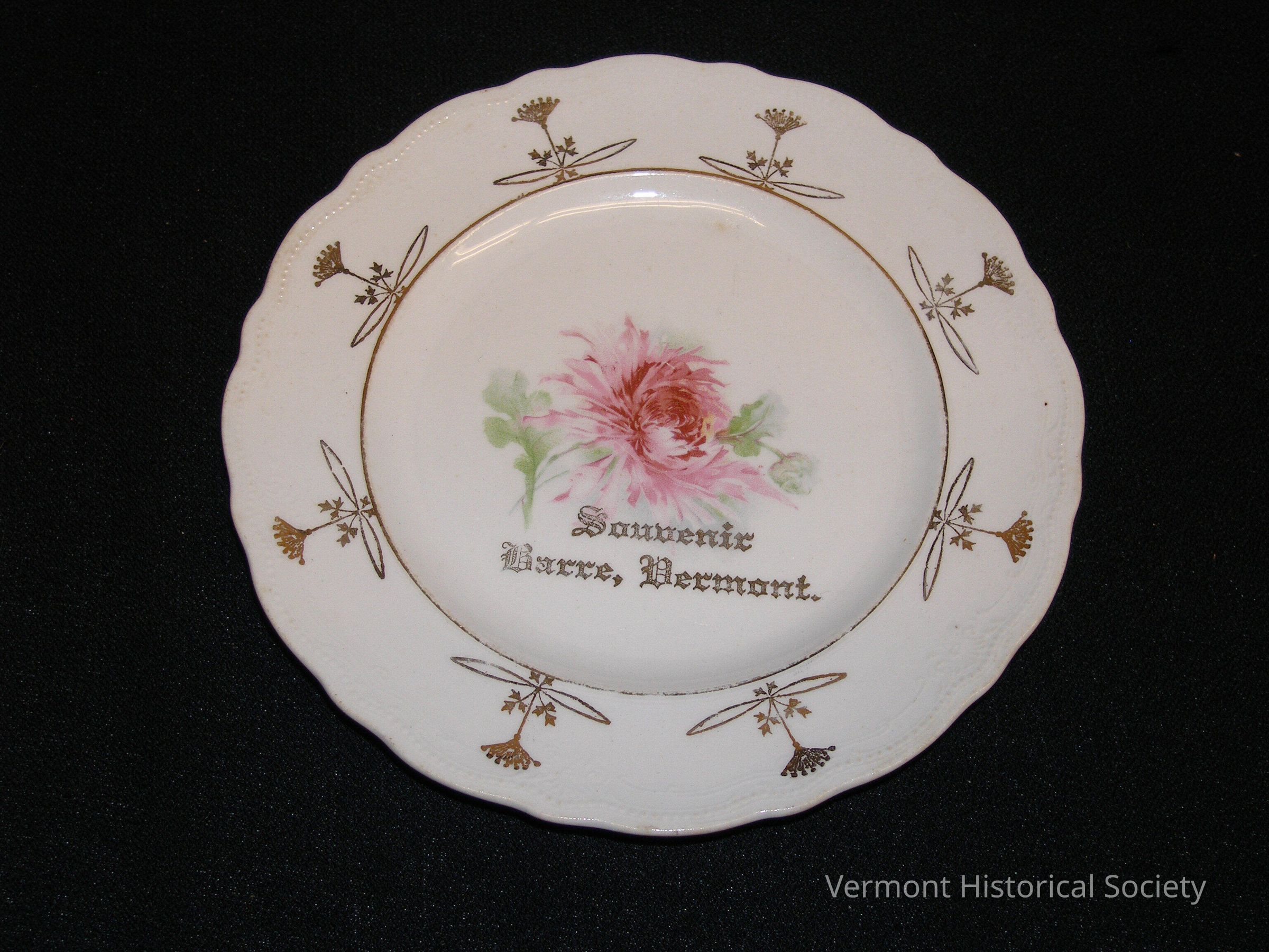 White porcelain saucer decorated on the rim with gilded fan-like flowers. The center is printed with an illustration of a pink peony with green leaves and the inscription, "Souvenir Barre, Vermont." in gothic script.