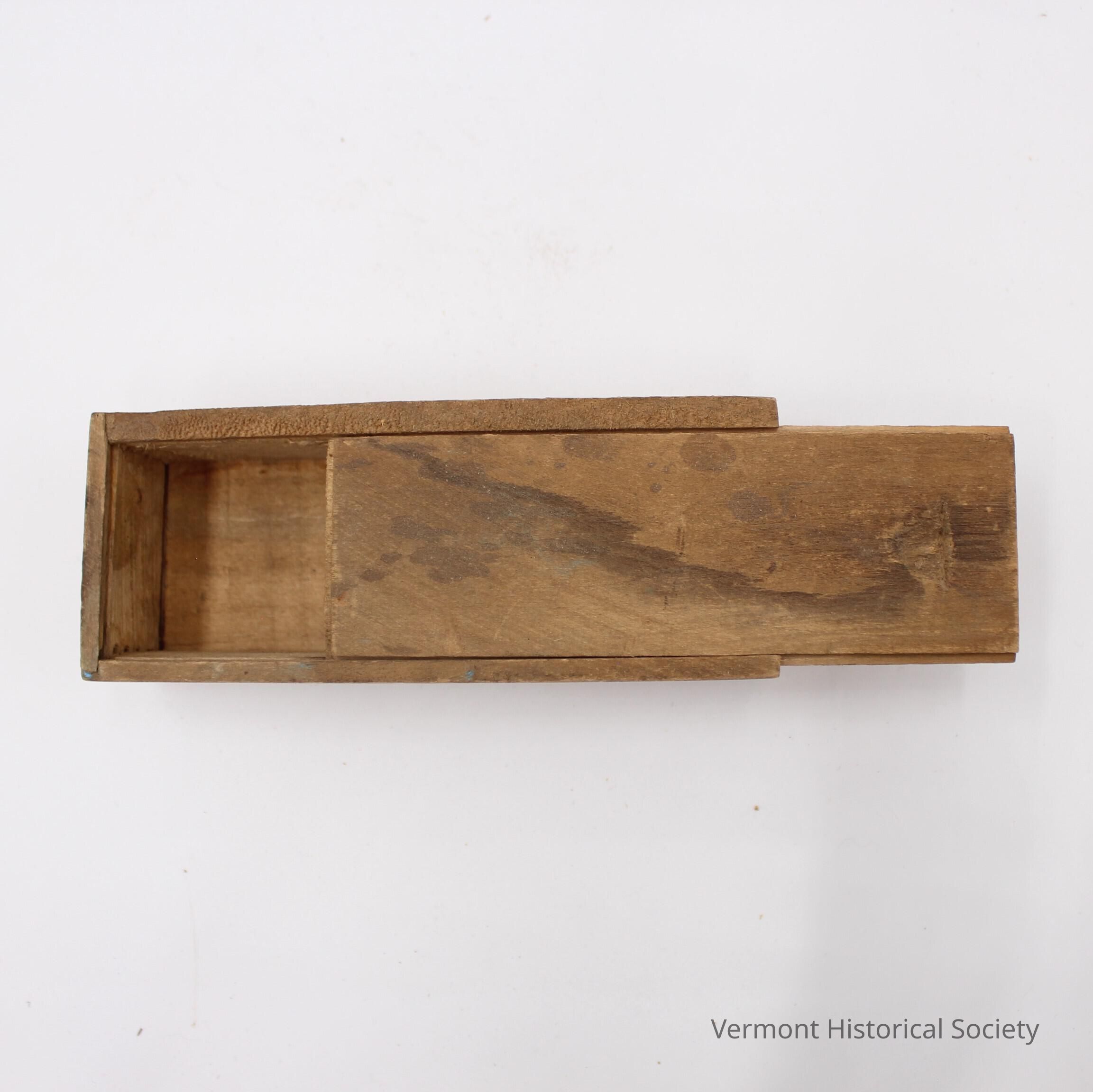 Small rectangular box with a sliding lid and a stamp. The corners of the box are held with glued box joints.