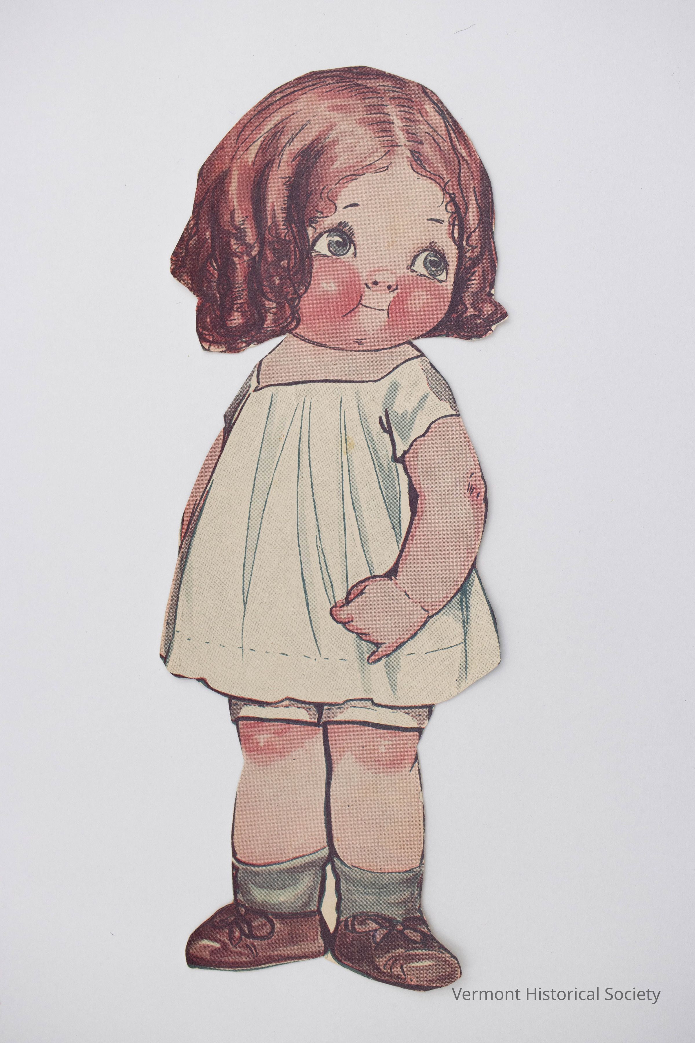 Small paper doll. The doll depicts a young child with brown hair and pink skin wearing a white dress undergarment, blue socks, and black shoes. The back shows a portion of a magazine page and the handwritten label, "totty".Context