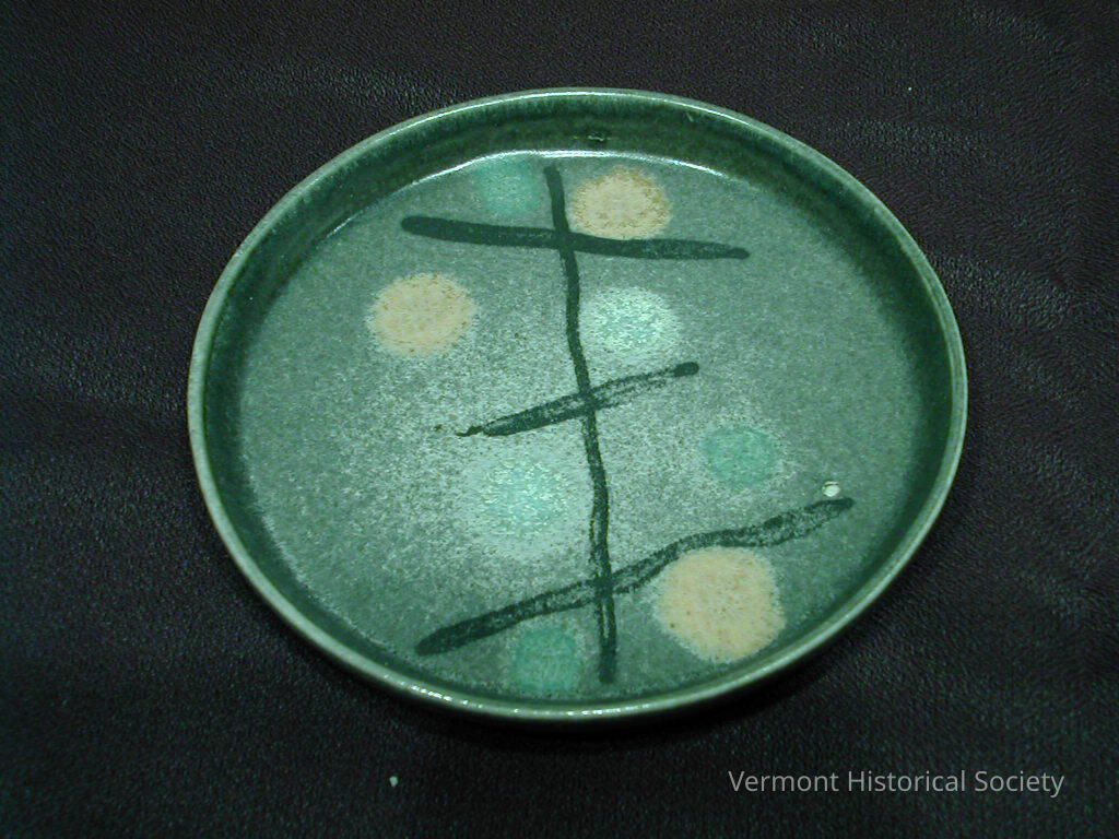 Rimmed ceramic saucer decorated with a painted design. The design consists of a black line with three cross lines, and blue, green, and pink dots. The bottom is marked, "VERMONT / BENNINGTON POTTERS 51290"