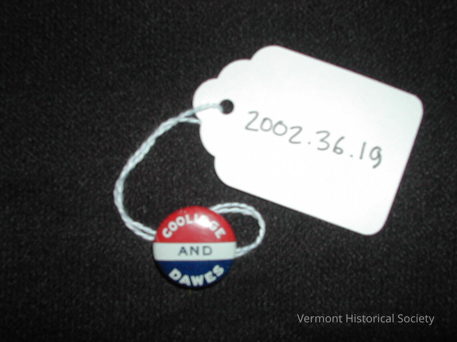 Round metal button printed red on the top and blue on the bottom with a white stripe across the center. The words "COOLIDGE AND DAWES" are printed in white and blue.