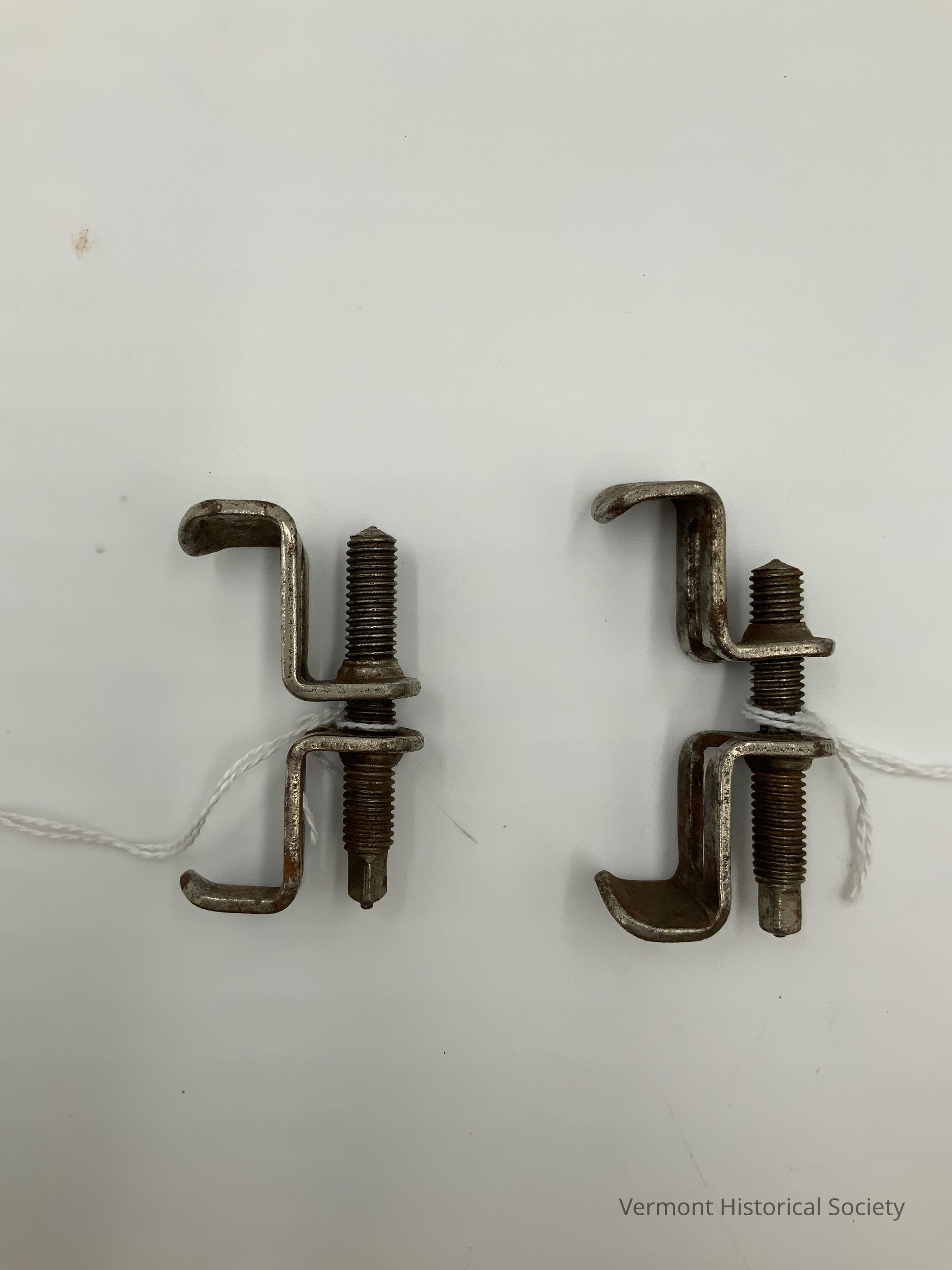 Metal toe clamps for roller skates. Each clamp consists of 2 brackets connected by a threaded bolt.