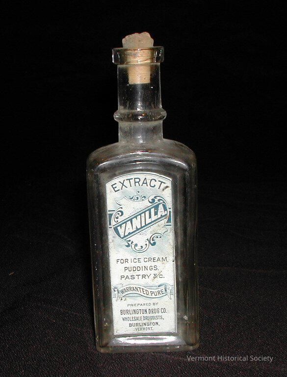 Small, clear glass bottle with cork stopper and paper label. The label reads, "Extract/Vanilla/For Ice Cream, Puddings, Pastry &c./Warranted PUre/Prepared by Burlington Drug Co. Wholesale Druggists Burlington, Vermont."Context