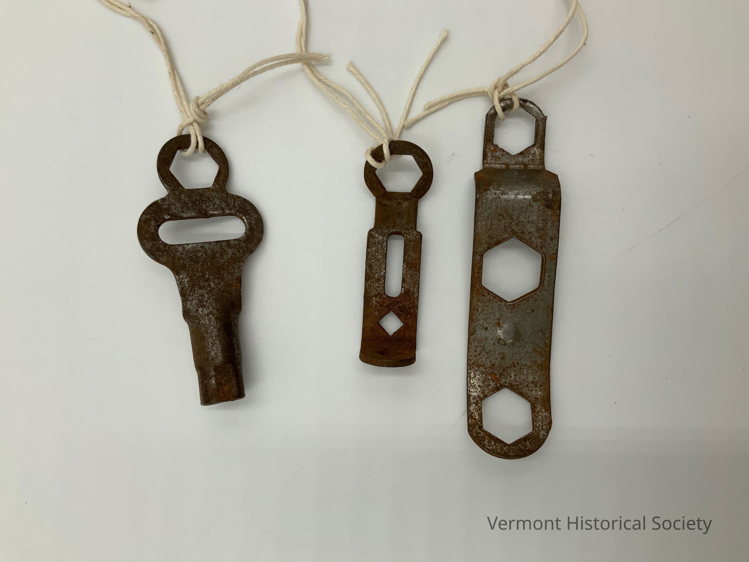 3 metal roller skate keys. 3a is key shaped with 3 openings: a hexagon, a long oval, and circular tube. 3b has 4 openings: 2 squares, a long oval, and a hexagon. The section with the hexagon is bent at a 30° angle from the rest of the key, and the other end (with a square) is bent at a 90° angle. 3c has 3 hexagonal openings, with one offset but parallel to the others.Acquisition