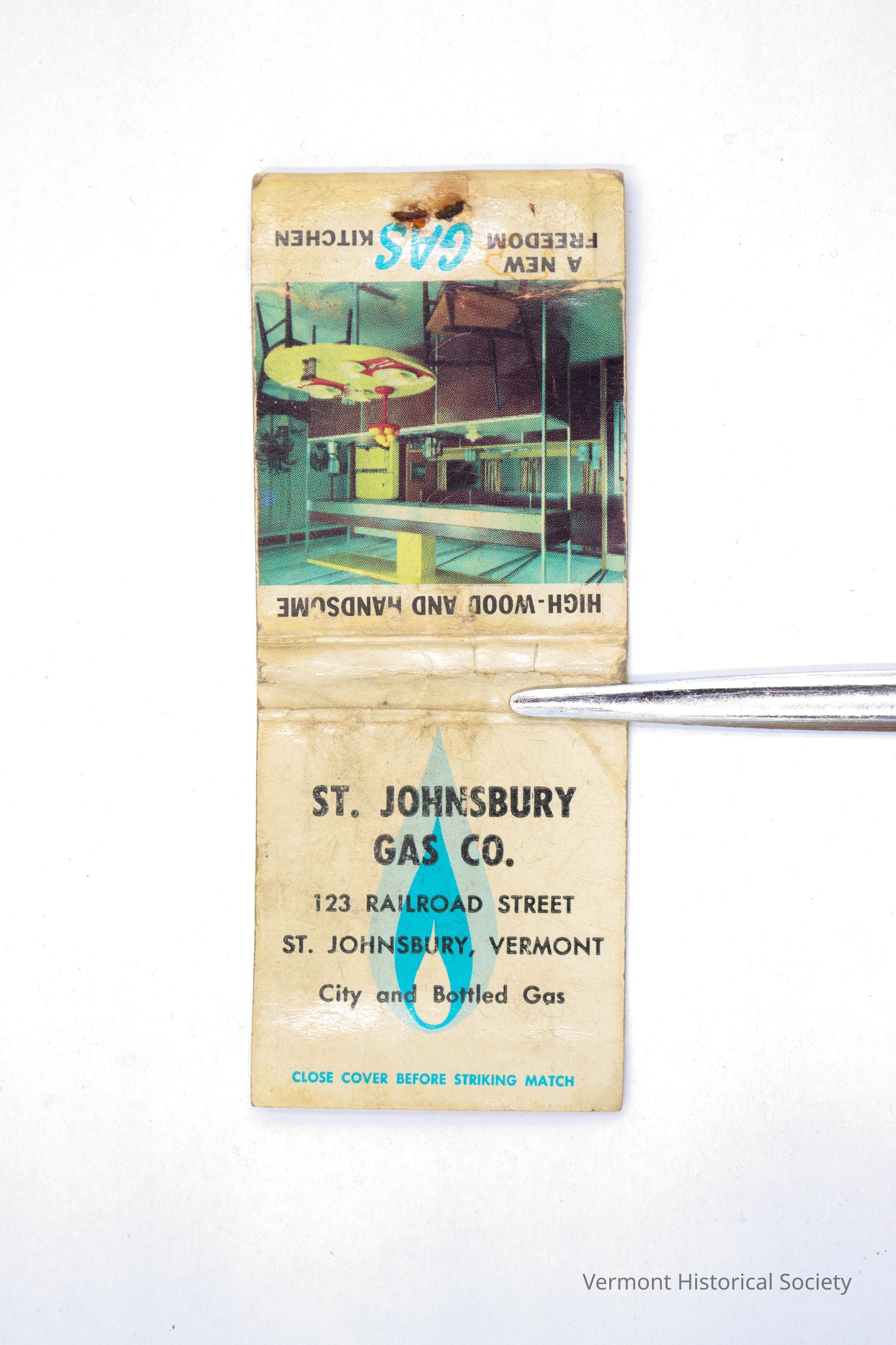 White cardboard bifold matchbook. The front flap is printed with the inscription, "ST. JOHNSBURY GAS CO. 123 RAILROAD STREET ST. JOHNSBURY, VERMONT City and Bottled Gas".