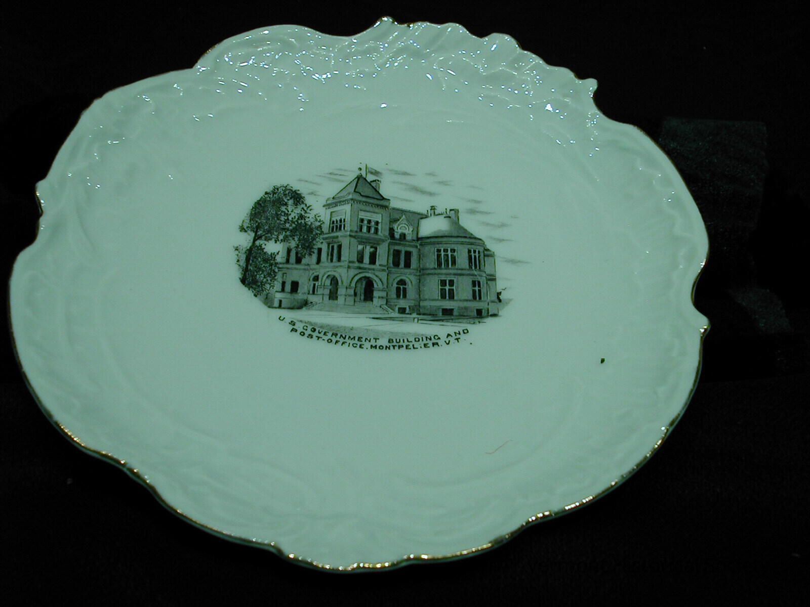 Decorative saucer printed in the center with an engraved illustration of a Victorian building. The building is labeled U. S. Government Building and Post-Office, Montpelier, V. T." The saucer is molded into a pattern of swirls. The reverse is marked, "MADE IN GERMANY, FOR MARVIN & SHERBURNE MONTPELIER VT 83."
