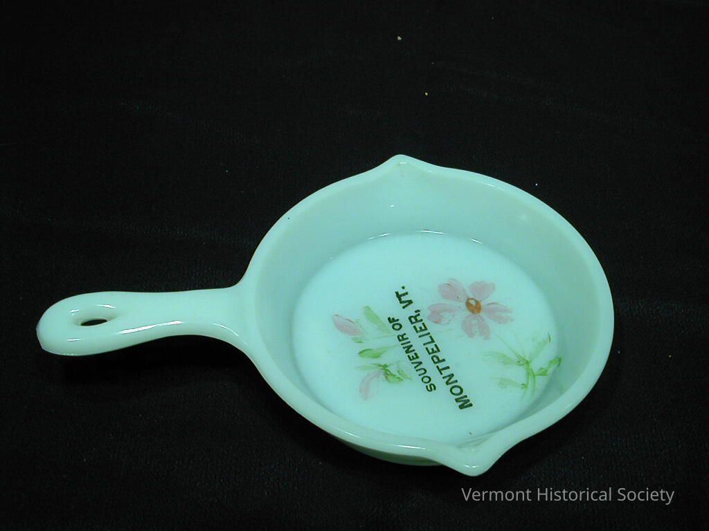 White milk glass ashtray in the shape of a frying pan. The interior is painted with pink flowers and green leaves and has the label, "SOUVENIR OF MONTPELIER, VT."