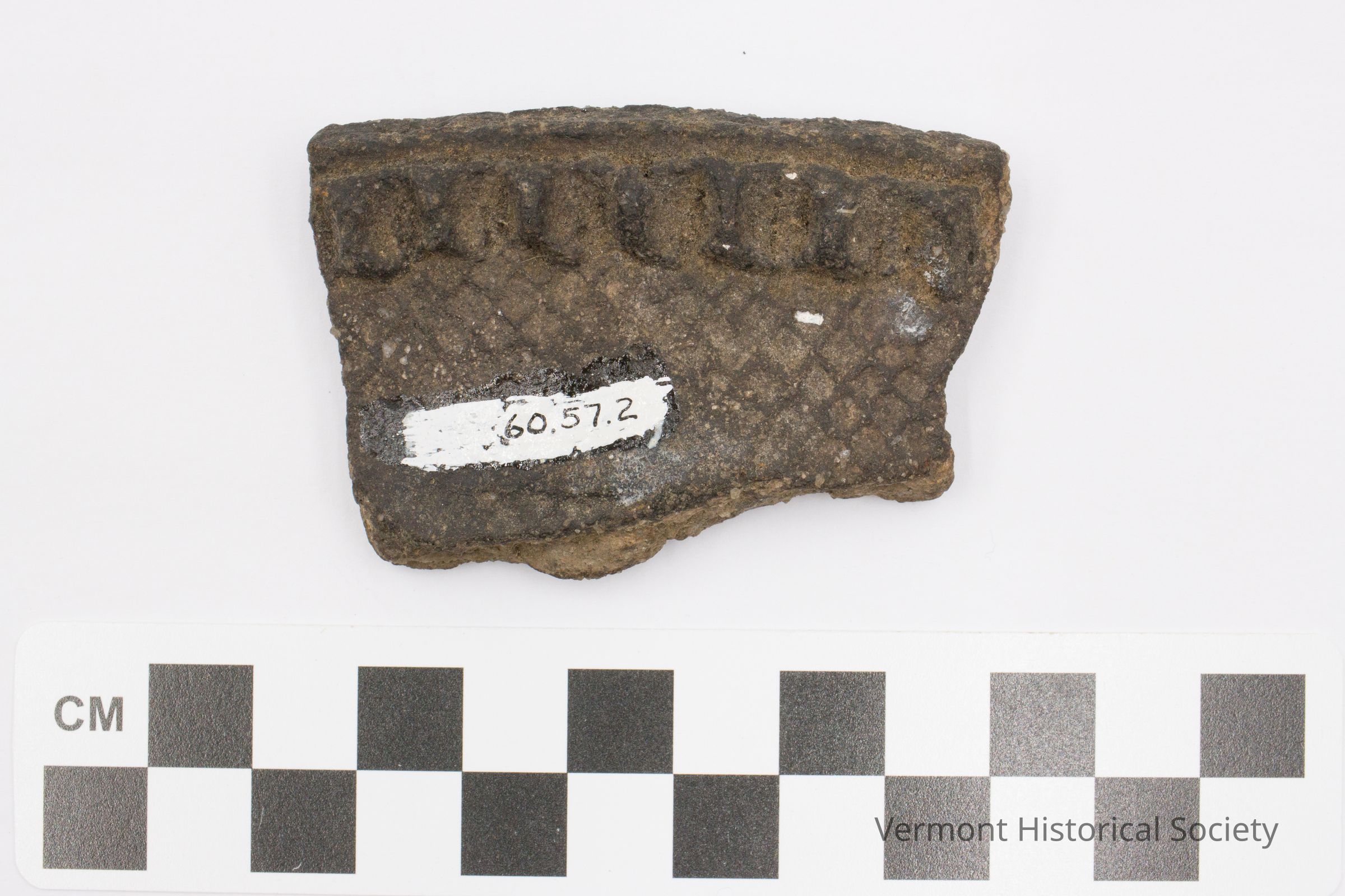Checked stamped rim shard with a border of raised, linear protrusions.