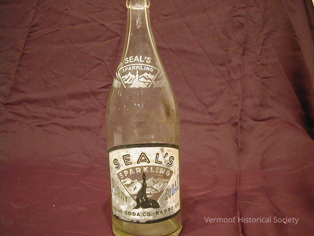Clear glass soda bottle. Both the body and neck of the bottle are labeled, "SEAL'S SPARKLING " with a logo of a seal balancing a soda bottle on its nose in front of mountain peaks.