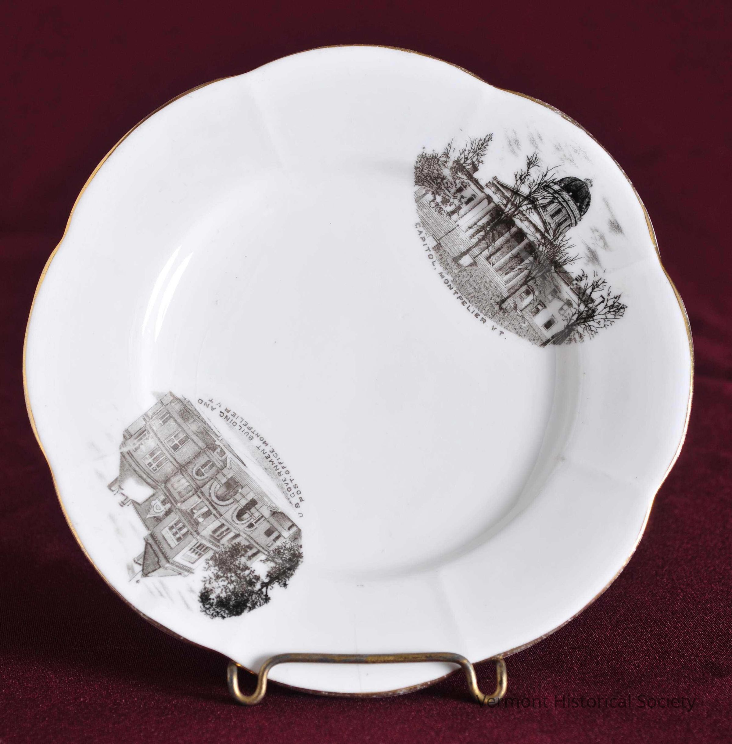 Decorative plate printed with two oval images of buildings set at opposite points of the rim. One shows the Statehouse set behind leafless trees. The other shows the Montpelier Post Office building.