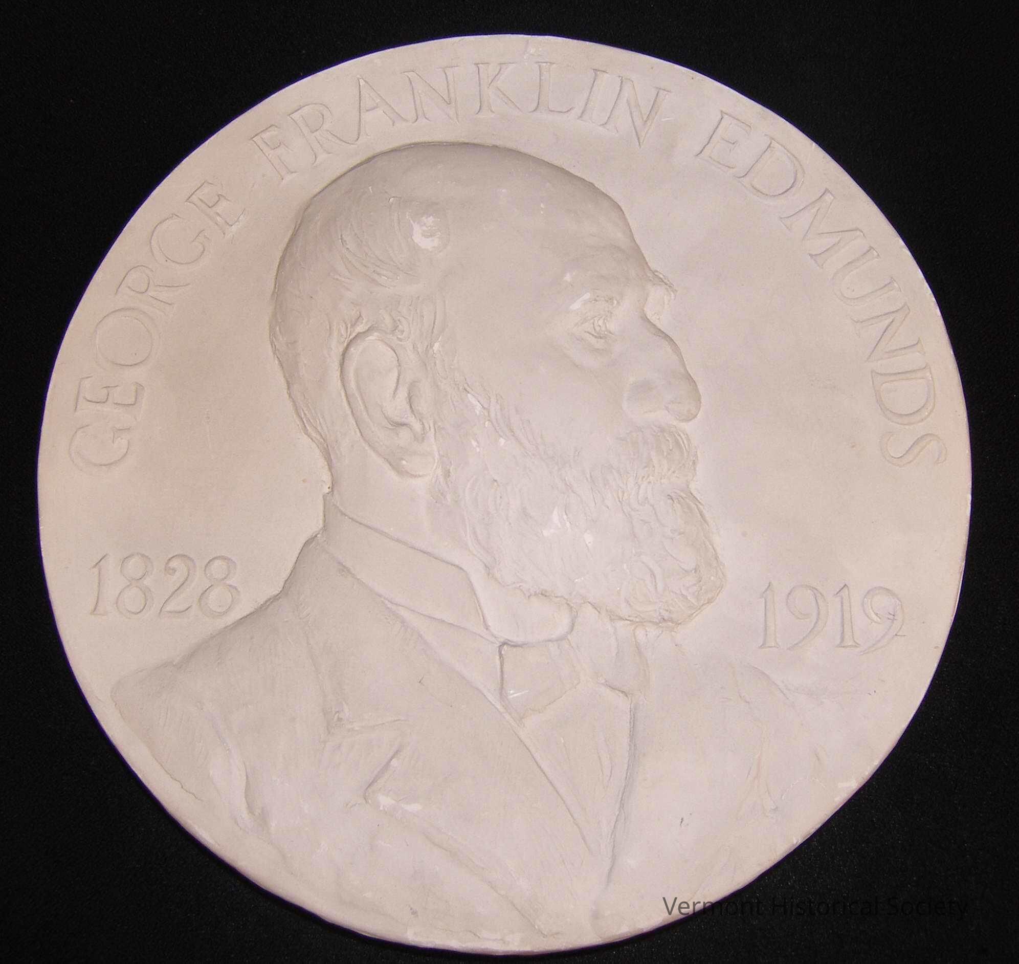 Two plaster medallions. One shows a bust of a man on one side and a long inscription within a laurel wreath on the other side. The face side shows a bearded man who is bald on the top of his head. He is wearing a suit jacket, high-collard shirt, and bow tie. The inscription, "GEORGE FRANKLIN EDMUNDS" rings the top edge and the dates 1828 and 1919 flank the man. The other has the inscription, "AWARDED BY THE VERMONT HISTORICAL SOCIETY TO ENCOURAGE YOUNG VERMONTERS TO STUDY THE HISTORY AND PROBLEMS OF THEIR STATE AND TO HONOR THE MEMORY OF GEORGE FRANKLIN EDMUNDS" in the center of a laurel wreath. There is a blank rectangle at the center bottom.