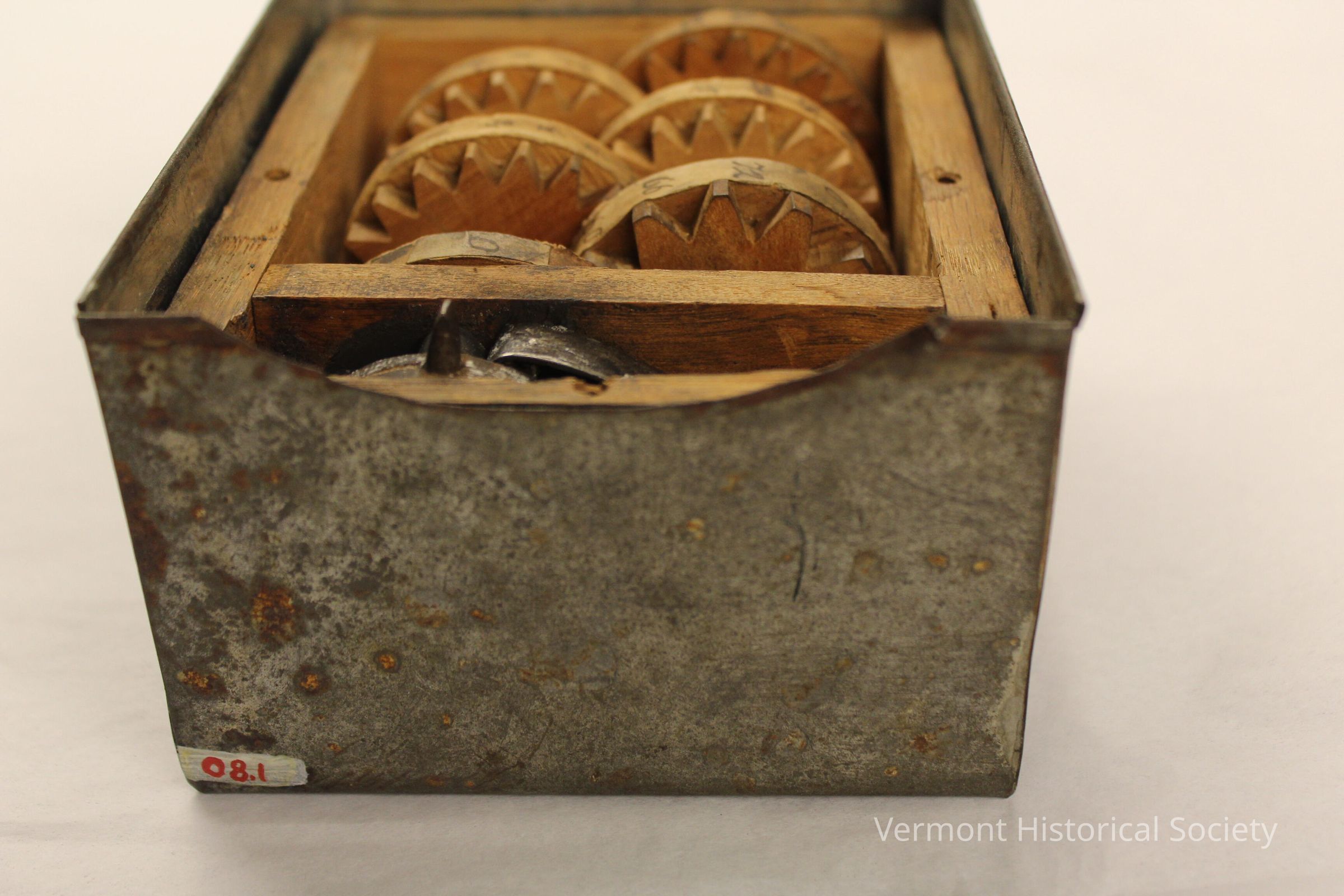 This cyclometer was created by Oren Cummins of Montpelier in 1841, and is entirely handmade. The concept of measuring distance was not new, but Cummins’s solution is noteworthy because it so clearly depended entirely on his own ingenuity to implement. The gears are hand-cut and hand-numbered, and the whole is a remarkable combination of applied mathematics and precision crafting.
