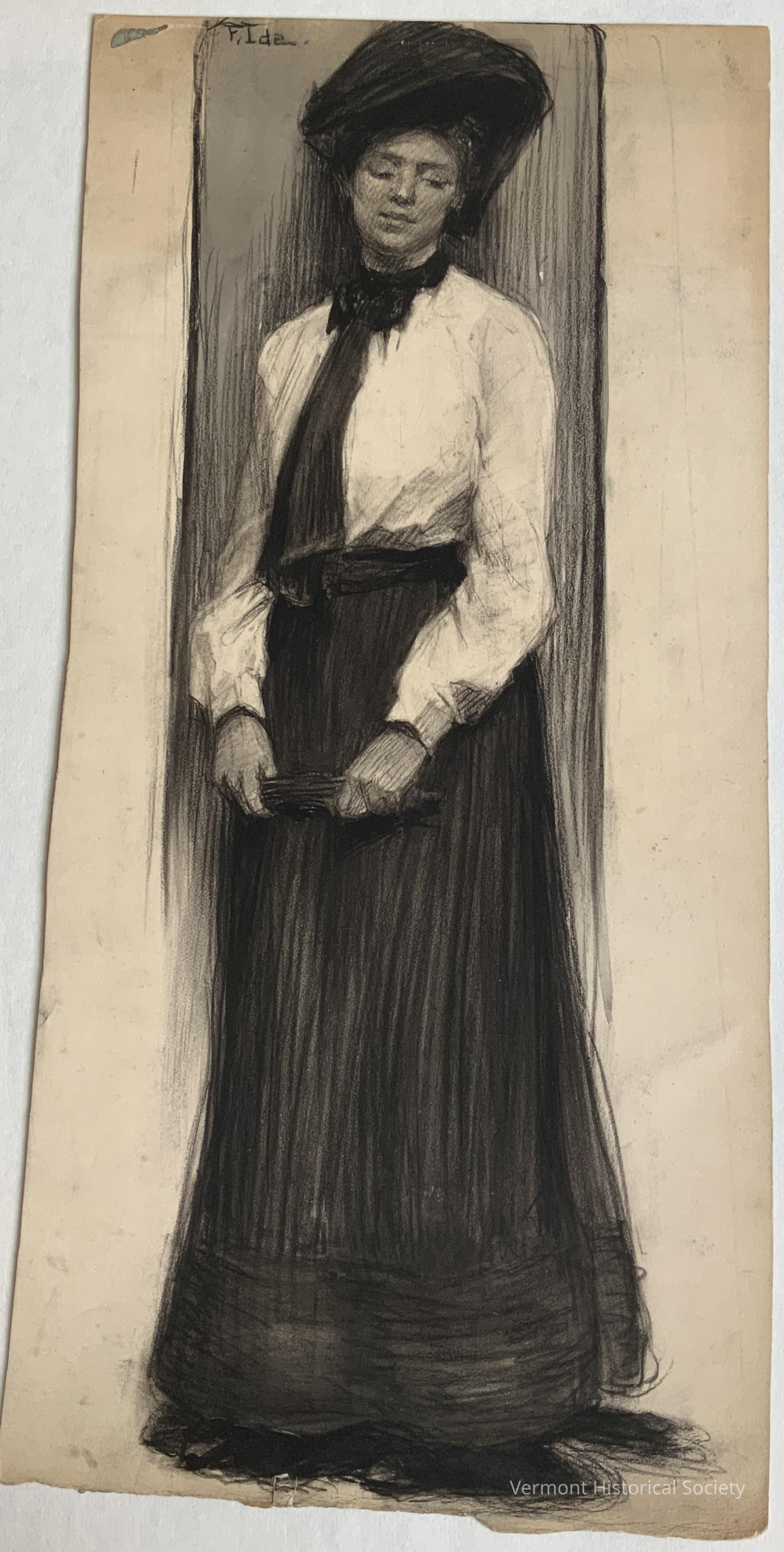 A full length portrait of a woman wearing a long dark skirt, white blouse, and long neck tie. She is looking down to her left. She also wears a hat and carries something in her hands. Her clothing is Edwardian in style. Signed in the top left corner and undated.Type of Drawing