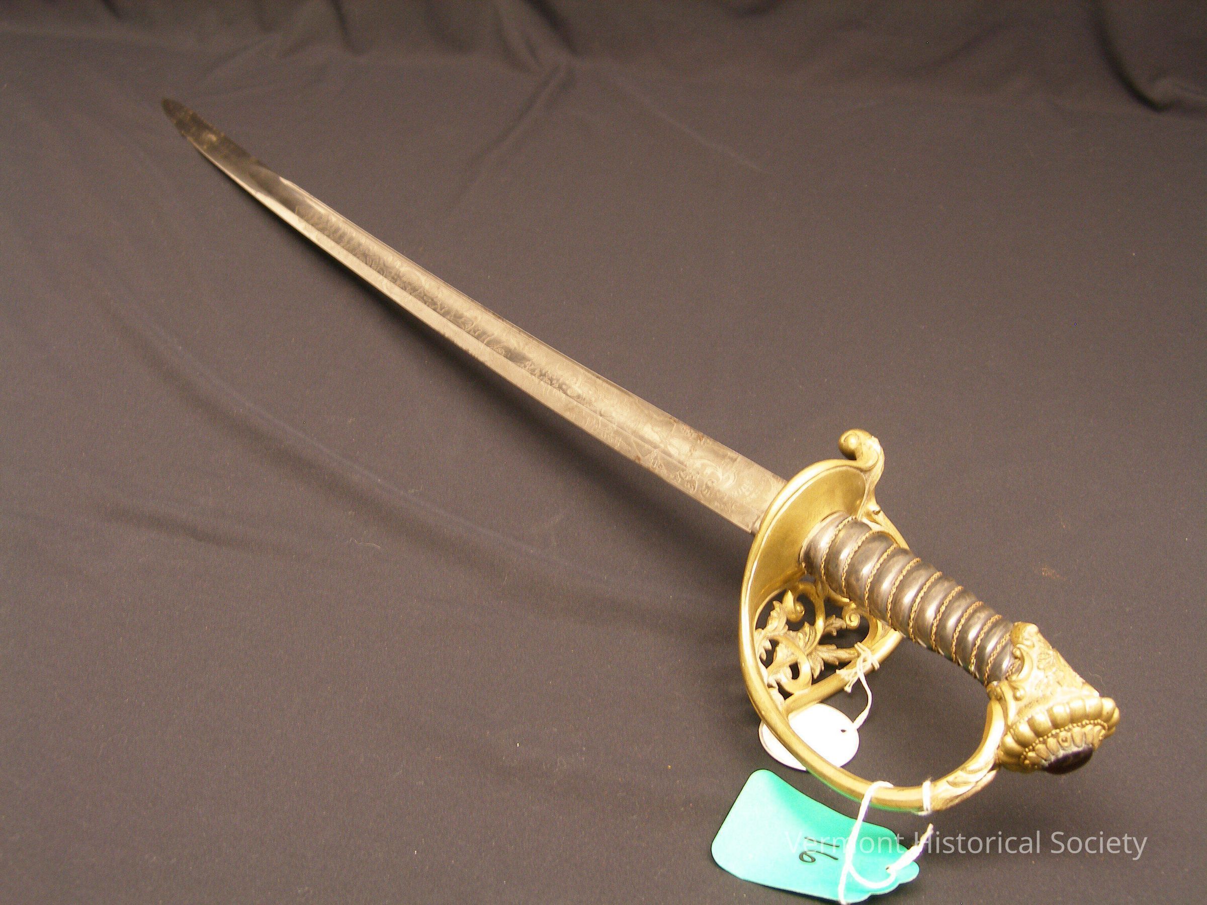 Ornate sword with leather scabbard. The handle of the sword is leather wrapped in gold-toned twisted wire. The pommel is molded into a floral pattern and set with a dark stone. The blade is lightly engraved with an all-over floral pattern and the inscription, "Capt LW Page from the Howard Guard". The blade has two makers marks: the first is stamped close to the rain guard and says, "COLLINS & CO., HARTFORD CONN. 1862"; the second is incorporated into the engraving and says "MILLER & co. NEW YORK".Context