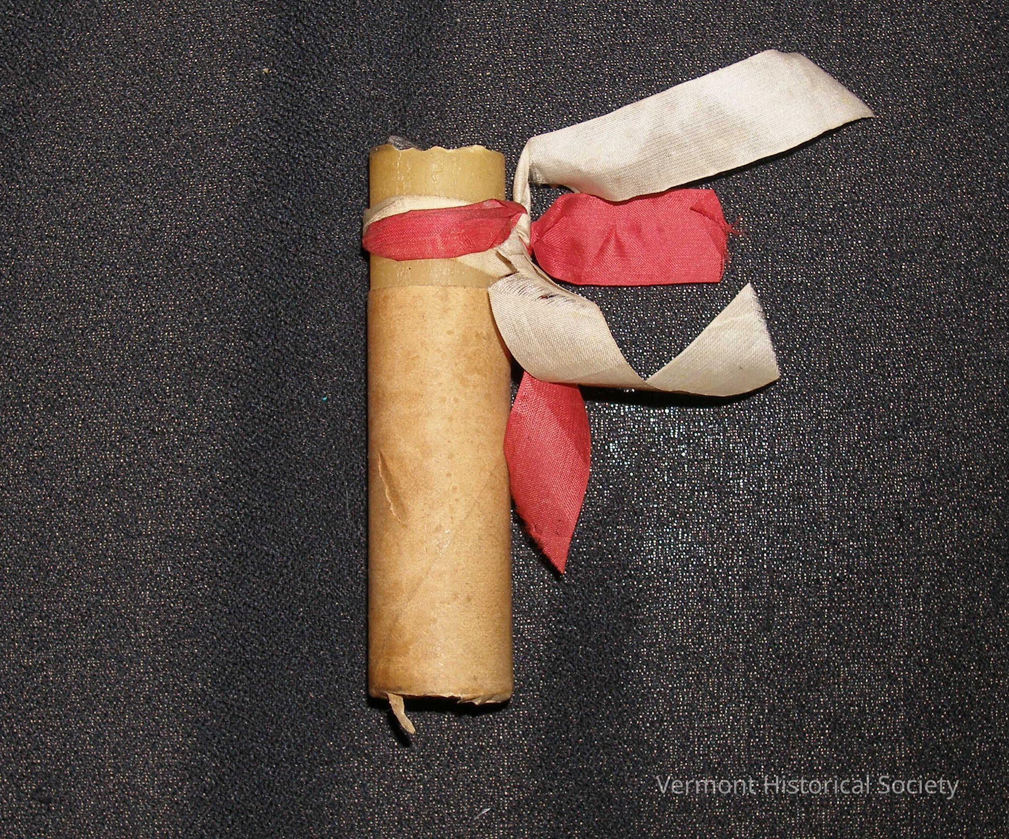 Paper-wrapped taper candle. Two ribbons, one cream and the other red, are tied around the paper wrapping.